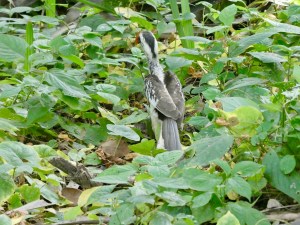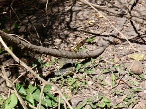 Once we ran out of bananas, we started the walk back to the entrance and along the way we spotted a Nile monitor lizard snaking its way through the underbrush. But the bigger coup was spotting a northern red hornbill on the path in front of us. Unfortunately, I was not fast enough to snap a picture when the bird was sitting on the path, but it hopped into the bush and I quietly walked in its direction and managed to catch a picture from behind and then a picture as it turned its head. I was thrilled to see the bird!