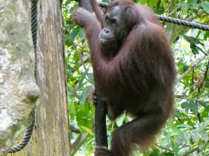 Now I am not sure what I expected, but what we got wasn’t it. We had to sit in a seating area behind glass and watch the feeding from there. It seemed very artificial and a huge letdown. And my pictures all have a green tint. Anyway, after about 15 minutes the feeding was over. And I am not sure how it happened, but a pig tailed macaque monkey managed to make into the enclosure and went to town on the bananas on the platform. Surprisingly, the orangutans (and the handlers) tolerated the interloper.
