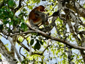 By 4:00 we had reached the lodge and were given cold cloths and a cold drink, assigned rooms and were quickly off and running for our first cruise on the river. We ended up going downstream in search of monkeys and almost immediately we spotted proboscis monkeys high up in the trees. Unfortunately, the monkeys did not want to come down so we were left to tilt our heads back and watch the show as they jumped from tree to tree.