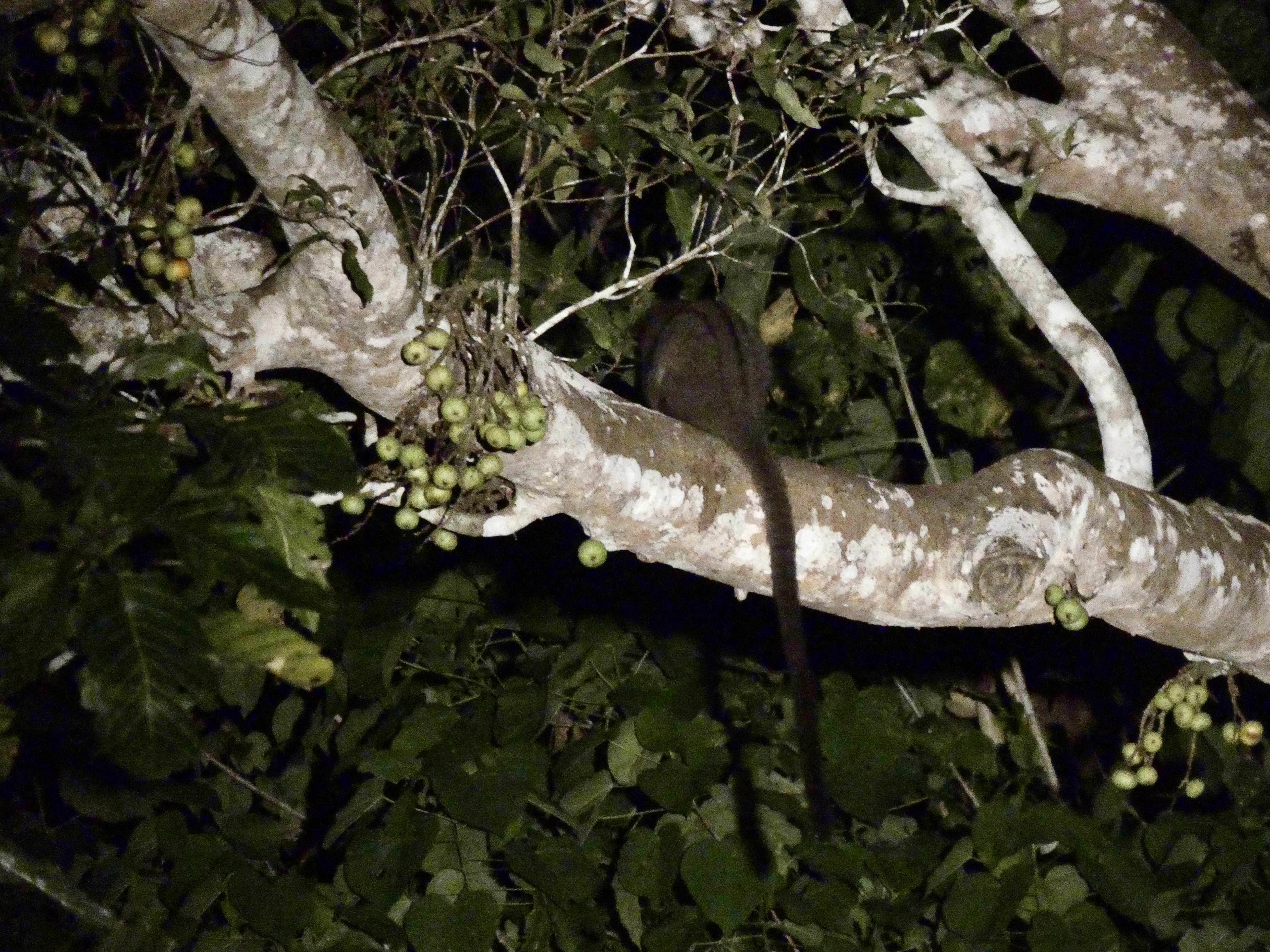 Now the topper of the night was spotting not one, but two common palm civets. As the guide was shining the light on the trees, we immediately spotted a pair of eyes. The civet scampered off up the tree before anyone could take a picture, but later in the hour, a second civet was spotted and this time I was able to take a picture albeit only of its backside.