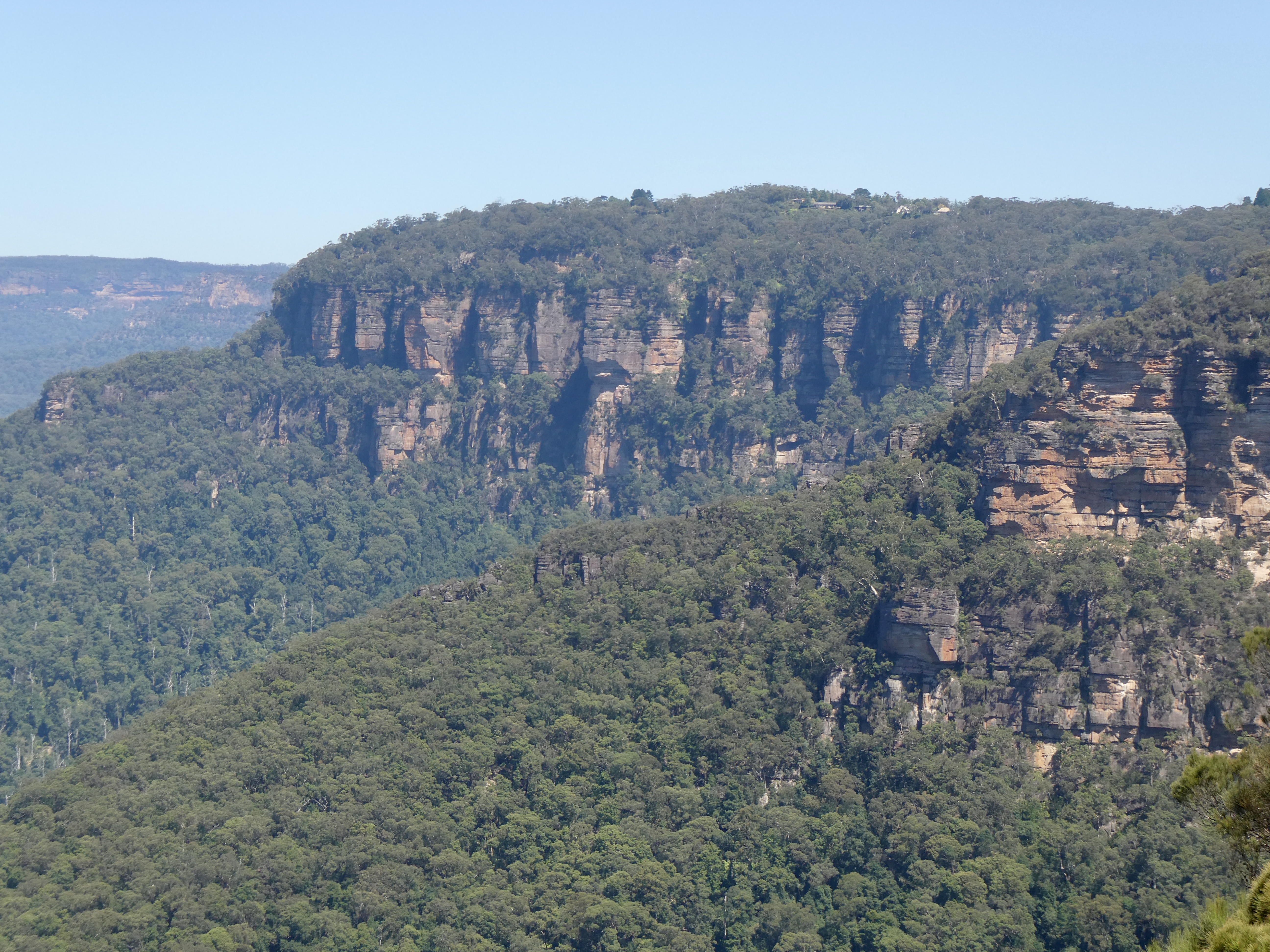 After Jamison Lookout, we climbed back up the stairs and began the walk along the Princes Track trail, which took us down stairs through rainforest, past gum trees and eucalyptus trees, which give the mountains their name. (When it is hot, the eucalyptus trees sweat eucalyptus oil, which is absorbed into the air giving the air around the mountains a blue tinge. Today was very hot and so the Blueys were out in full force.)