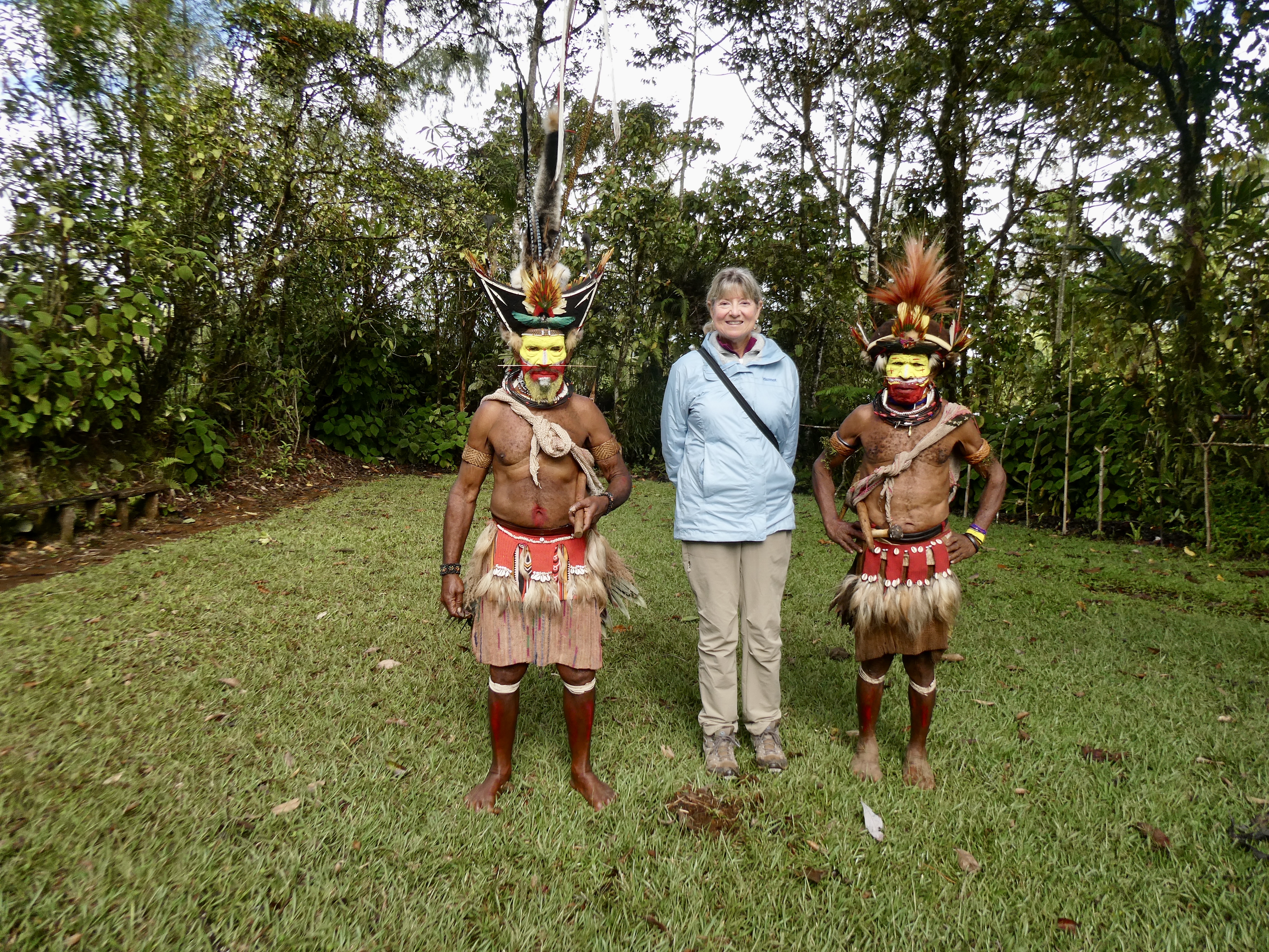 Anyway, with this background, we made a brief stop at a nearby village where I was met by two elders. One wore a ceremonial wig (which included bird of paradise feathers and a skinned possum to which the feathers attached) while the other wore an everyday wig. Today most of the Huli men only wear these wigs and attire during special occasions.