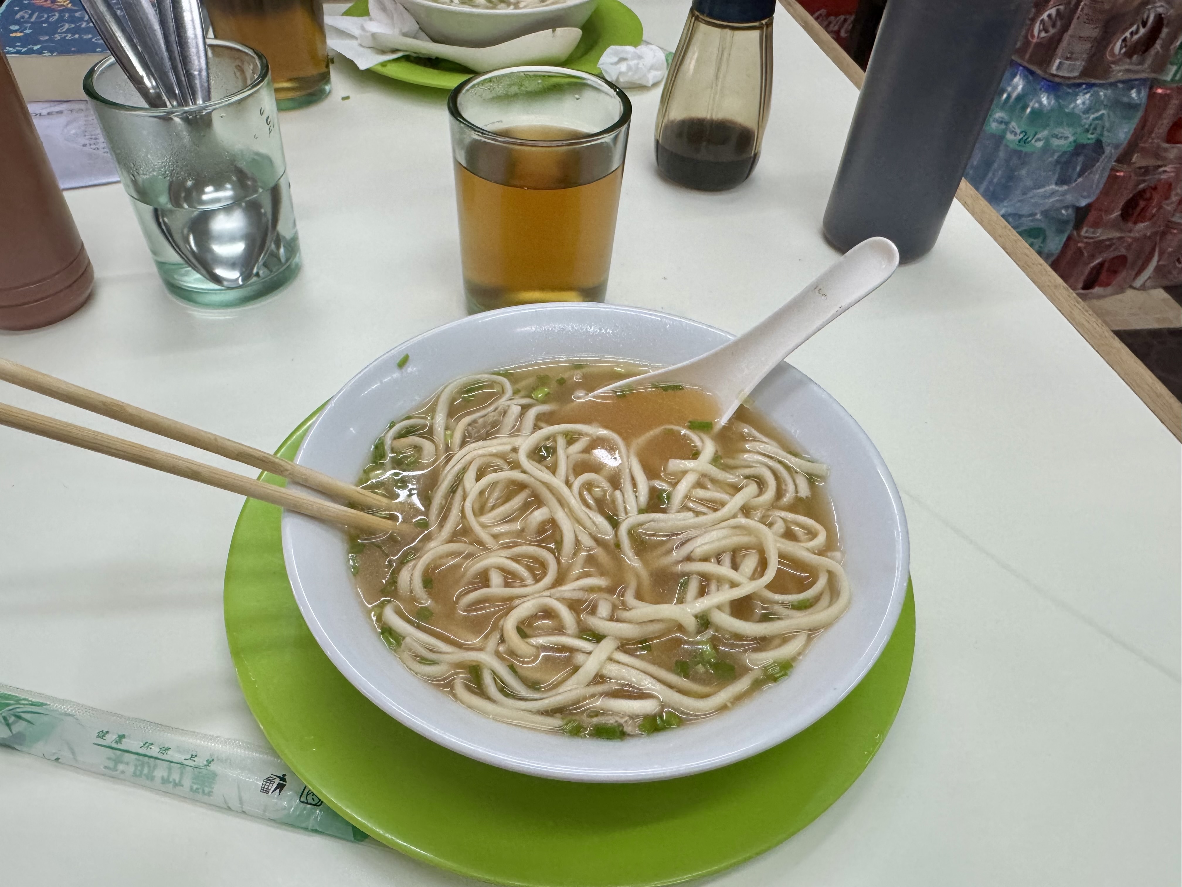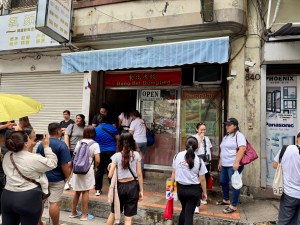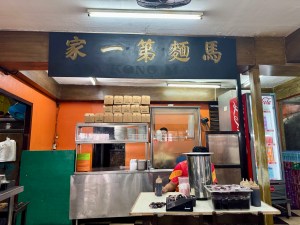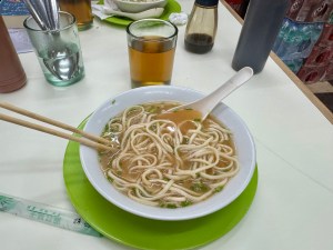 From here, we walked down the street, took a left past more Chinese produce stands and shops and crowds of people now filling the streets before turning onto another street to reach MaSuki, a restaurant specializing in chicken mami, a chicken broth soup filled with thick noodles, which the founder of the restaurant began selling out of a cart in 1918.