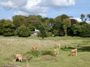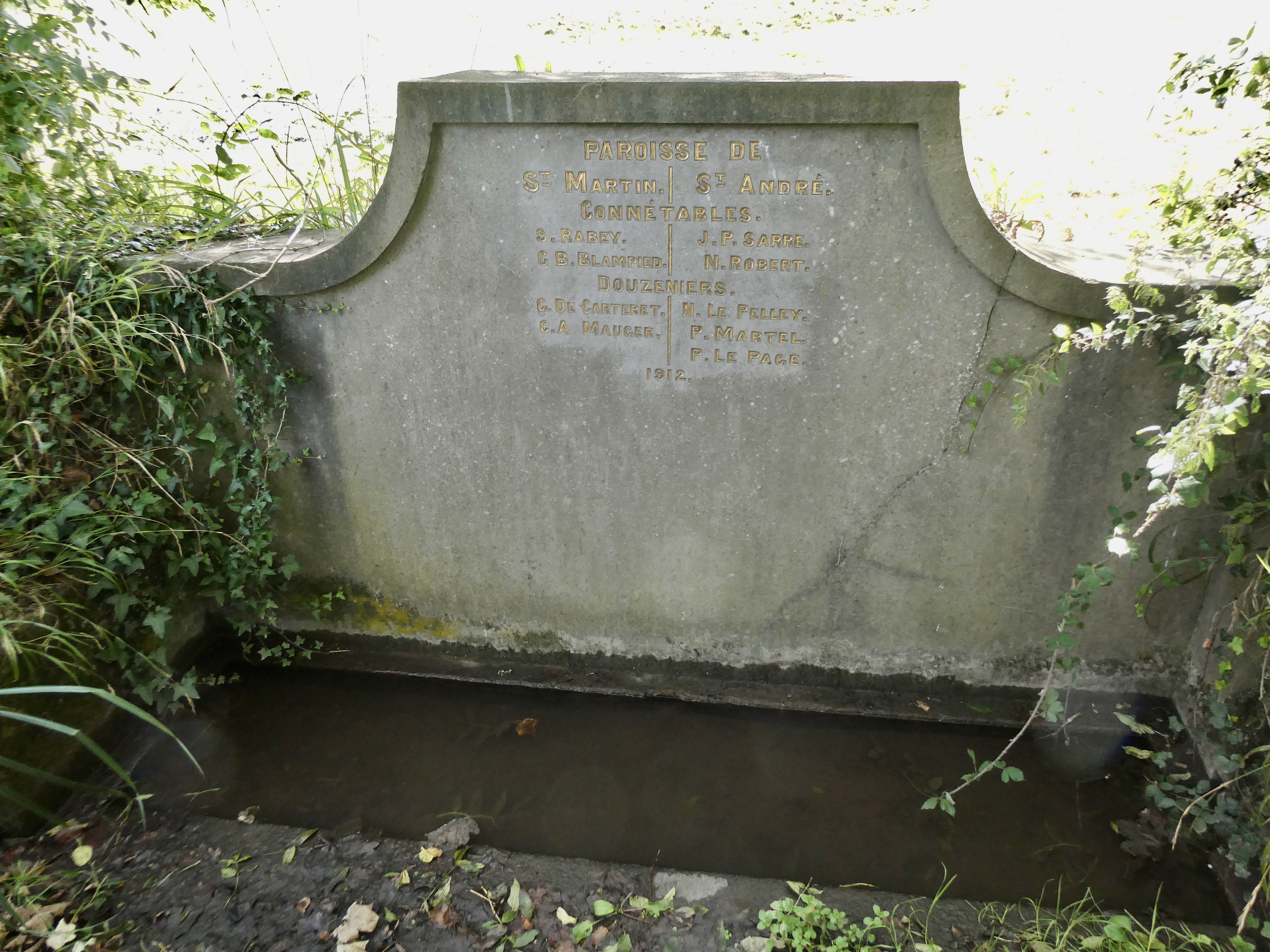 From here, we began to meander into the countryside, passing pastures where more than 1,600 Guernsey cows graze. In fact, the cows are permitted to graze on any public lands with the only impediment being water so as we drove along, we frequently passed arbreuvoirs, 19th and early 20th century granite troughs built on the side of the road where a spring meets the road. These arbreuvoirs were used to collect water for the cattle and can include the names of local officials who held a prominent position in the parish (the name used on Guernsey for the various regions of the island).