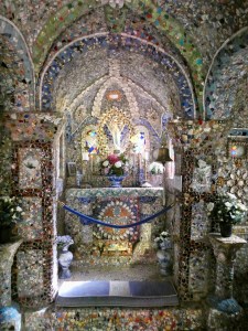 Now The Little Chapel is located in the Les Vauxbelets valley, Saint Andrew, Guernsey and was the brainchild of Brother Déodat, who in 1914 decided to construct a miniature version of the Rosary Basilica in Lourdes, France, including the grotto and basilica. The current iteration was Bother Déodat’s third attempt and measures just 16 feet by 9 feet and can fit up to eight people. And in addition to its unique size, The Little Chapel is covered both inside and out in mosaic pattern of seashells, pebbles and broken pottery, china and glass. The effect from a distance is striking with a blend of dazzling colours. And the inside is equally stunning.