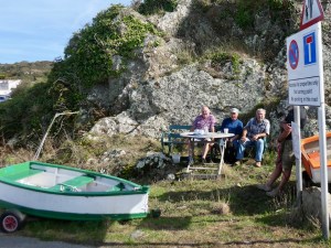 After stopping at Batterie Generaloberst Dollman, we headed back down towards the west coast of the island for a stop at Portelet Kiosk, a location where many fisherman anchor their boats for afternoon tea. And while we were parking the Land Rover, three fisherman relaxing in the sun “demanded” I take their picture so that I could have a memory of three authentic Guernsey fisherman. The three were the very definition of “character”.