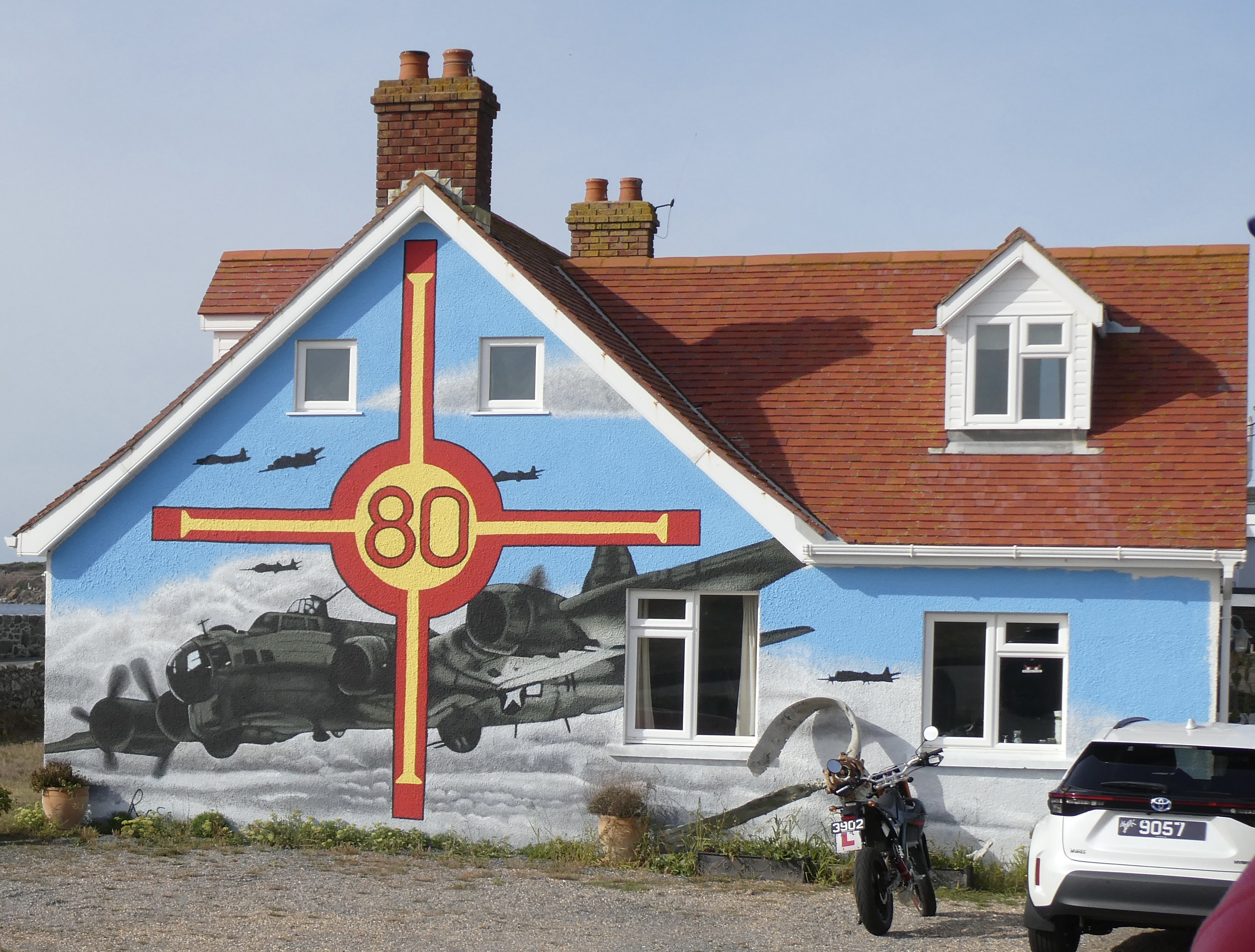 And as we drove along the bay, we passed numerous small fishermen’s cottages with spectacular views to the channel, including one fisherman who found the propeller of an old U.S. warplane that had crashed into the channel and decided to paint the side of his house into a memorial to those who died on the plane. (And if you look closely at the picture you can see the actual propeller on the ground.). The orange and yellow cross is the Guernsey flag and the 80 in the middle is a tribute to the 80 years since Guernsey was liberated from Nazi rule.)