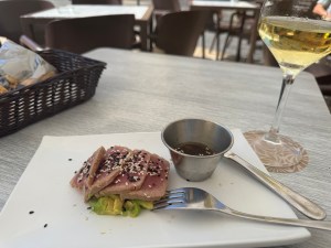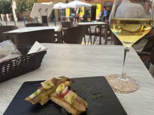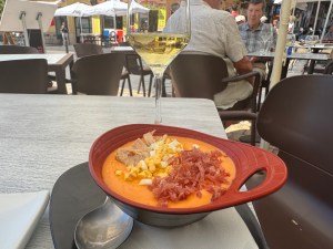 I then decided I needed to find a place to eat amongst all of the open air restaurants, bars and shops surrounding the square and opted for Cafe Bruselas. This turned out to be one of my best decisions since I arrived in Spain. I ordered a glass of white wine and three tapas: Salmorejo (a regional soup specialty like gazpacho, but thicker with additions of pieces of boiled egg, jamon (ham) and tuna; smoked sardines with tomato jam and cheese; and Tuna Tataky and avocado. Each of the tapas was absolutely lights out, fantastic. I would crawl on my hands and knees to have the smoked sardines again. Absolutely stellar food and preparation.