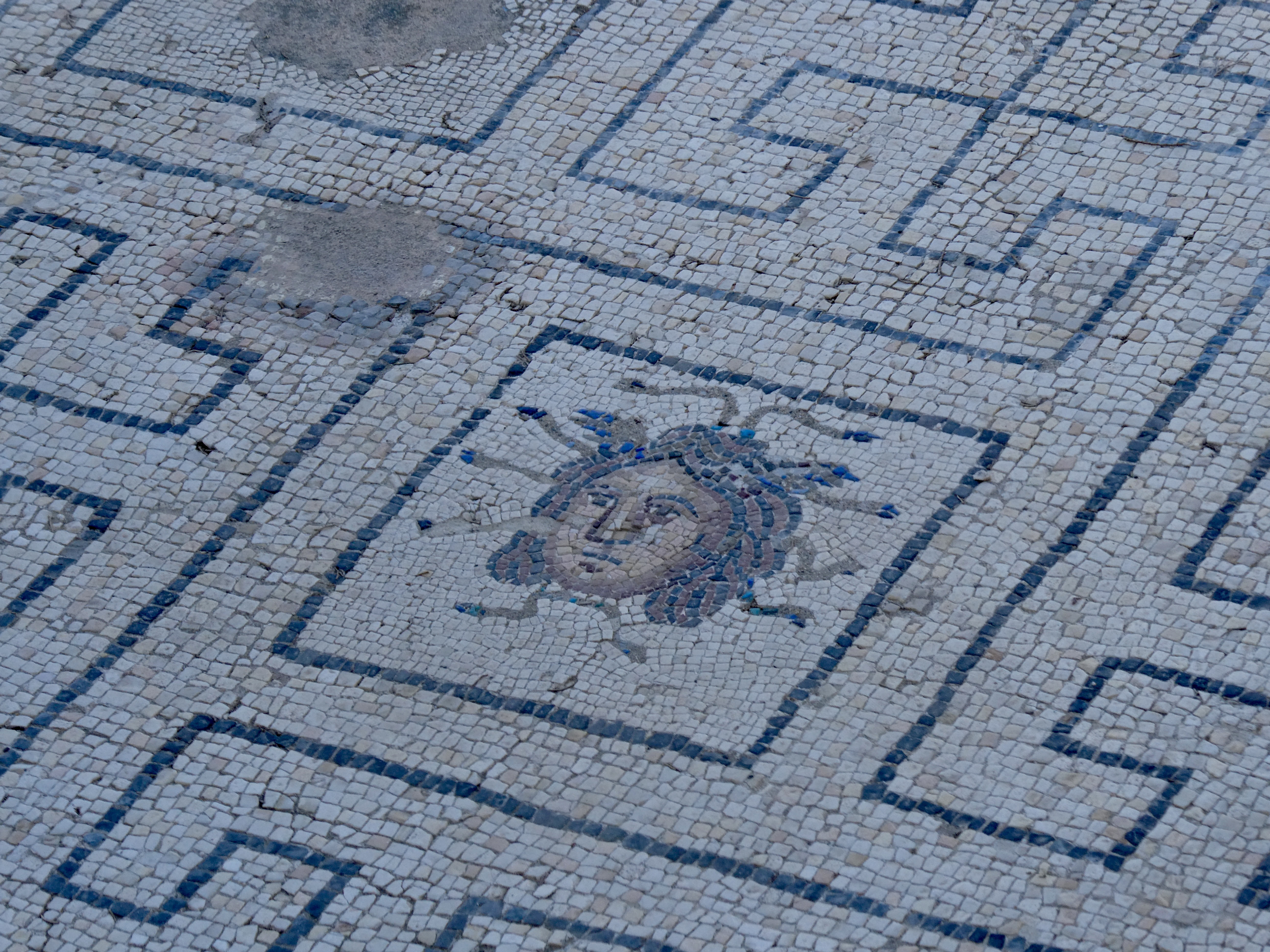 The building was likely used for meetings and banquets. There were communal latrines (with a lovely mosaic for folks to enjoy) as well as a very interesting mosaic floor that was made up of geometrical shapes. Now I have seen a LOT of Roman mosaics over my life, but I have never seen a mosaic made up of geometrical shapes. Usually mosaics are made up of small square tiles. VERY unusual.
