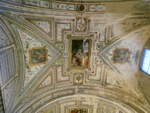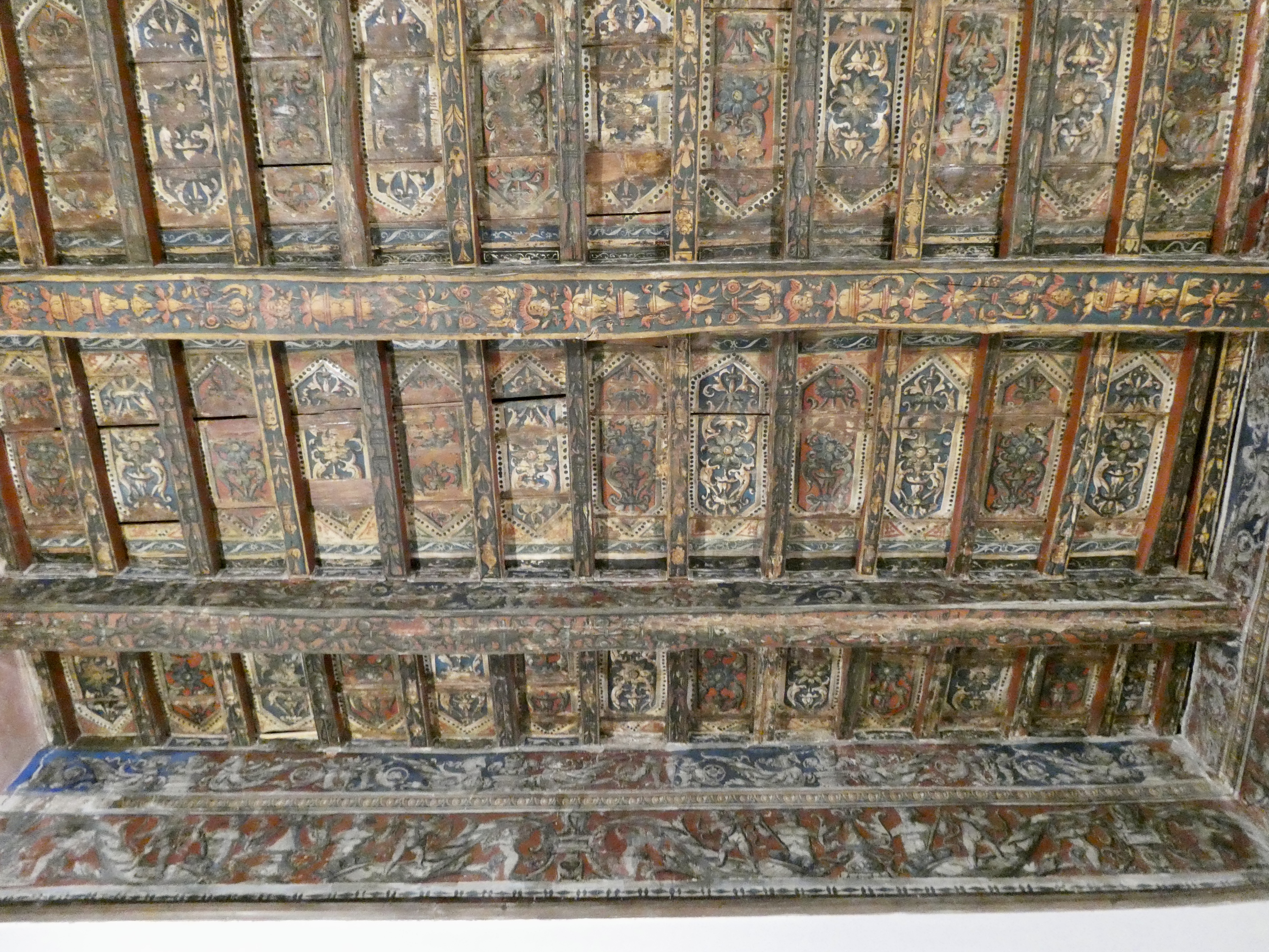 From here, we made a brief stop in the Heritage Document room that featured translations of the Bible from Latin and Hebrew into Spanish. Now this room would not have been particularly notable except for the unbelievable wooden ceiling with hand painted designs featuring flowers and angels and colourful designs. Gorgeous.