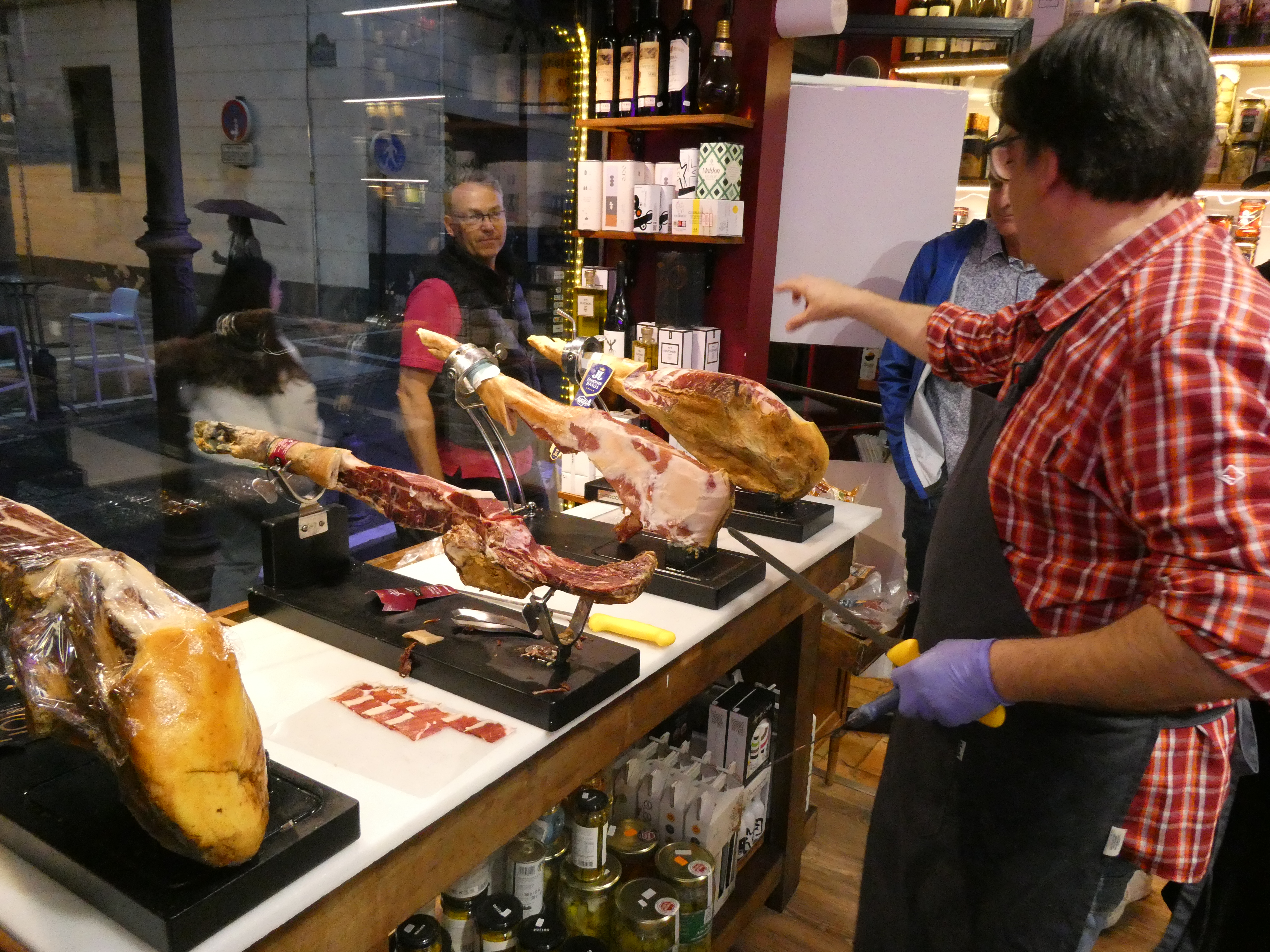 Now the proprietor was quite the character and had each of us try our hand at carving a thin slice of jamon. There is a very particular way to not only hold the knife, but to cut the ham with a gentle sawing motion. I managed to give it a go and was to too bad.