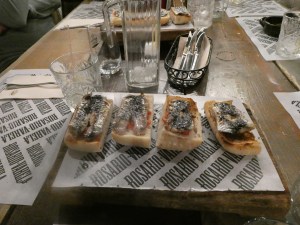 The second dish required the server to come to the table and cook the sardines that made up the next course. Specifically, we were served a small piece of bread covered in tomato sauce and topped with a fresh, toasted sardine. Yum.
