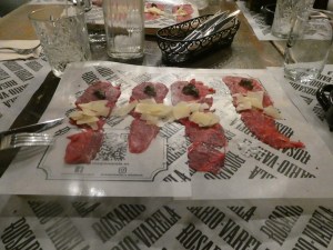 The final dish was beef carpaccio topped with thin slices of cheese and truffles. The idea was to spread the cheese and truffles over the thin beef, then roll the beef into itself and enjoy. This was really good as well. In fact, this place, was in my opinion, the hands down best spot of the night.