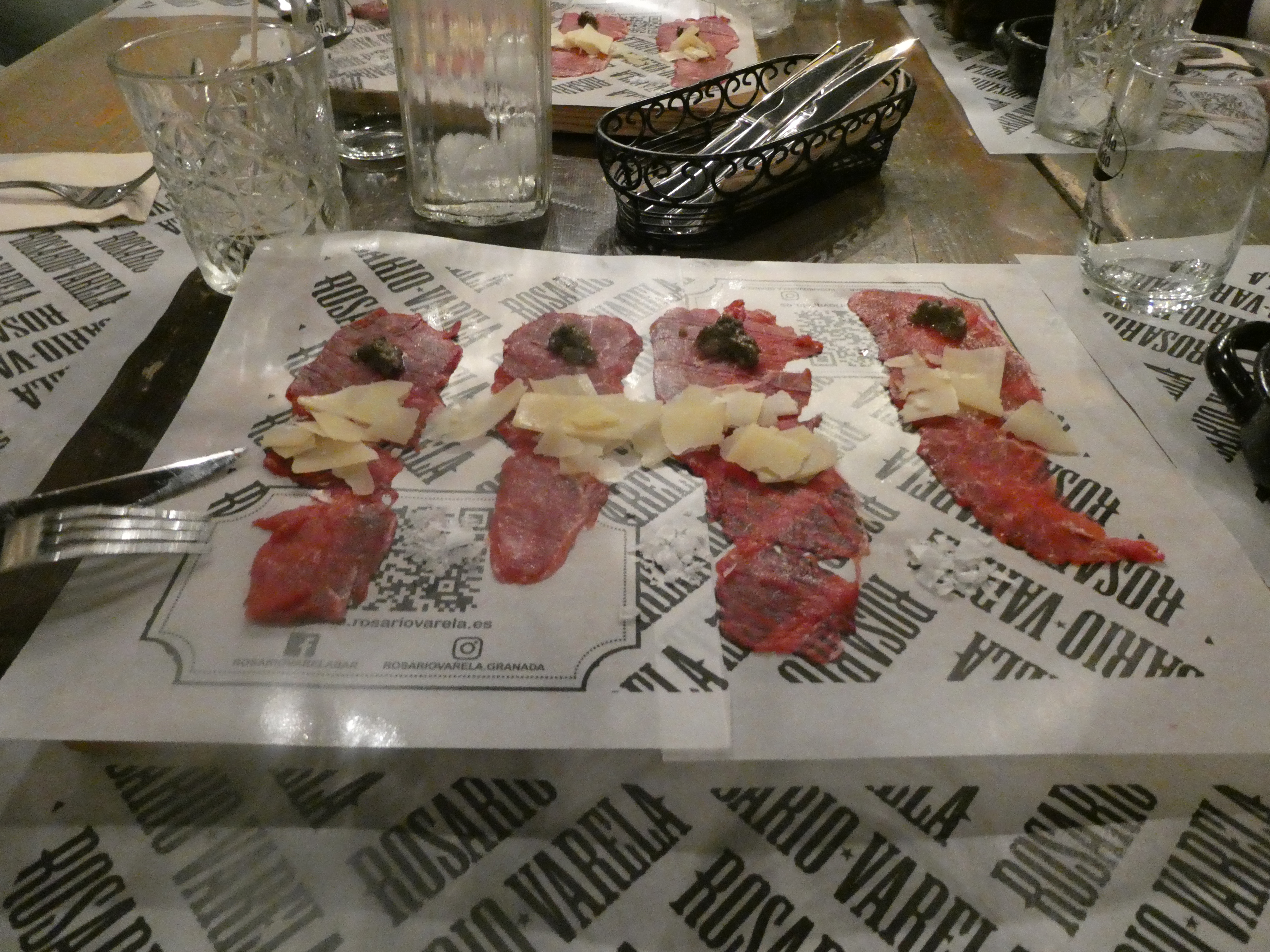 At 7:30, I met up with Juan Miguel, the Food Lovers guide as well as seven other folks for a tapas tour around old town Granada. First up was a little gourmet shop where the proprietor told us about the various kinds of jamon they have in Grenada. And while I was aware of jamon serrano and the four grades of jamon ibericco, I did not know that Grenada had its own “white” jamon, which was quite tasty, but not quite up to the jamon ibericco black.