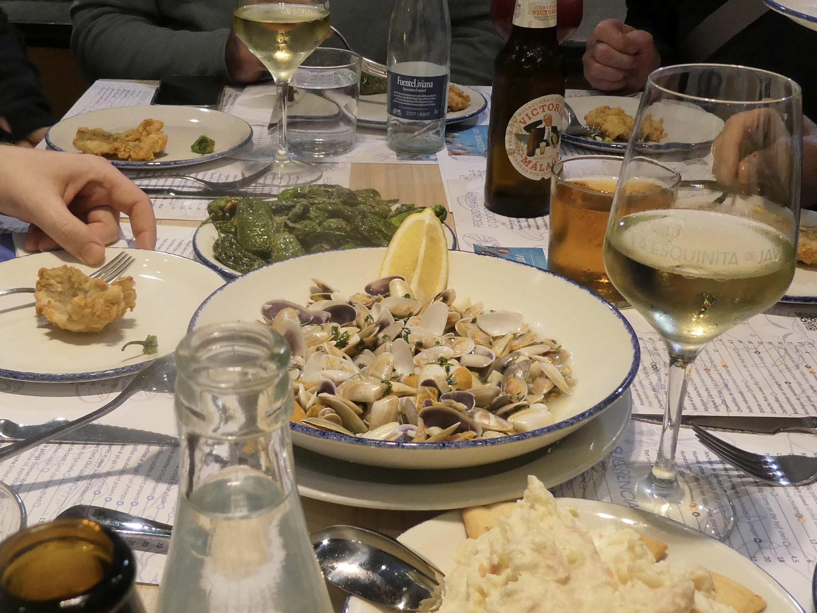 We then moved on to a place that specializes in all things fish and shellfish, La Esquinita de Javi. Here, we had some Merida white wine (excellent and tasted similar to what I had been drinking while in Merida), along with fried cod, Russian salad (so named because the salad is white not because it has anything to do with Russia and is basically potato salad with pieces of prawns in it) and shishito peppers.