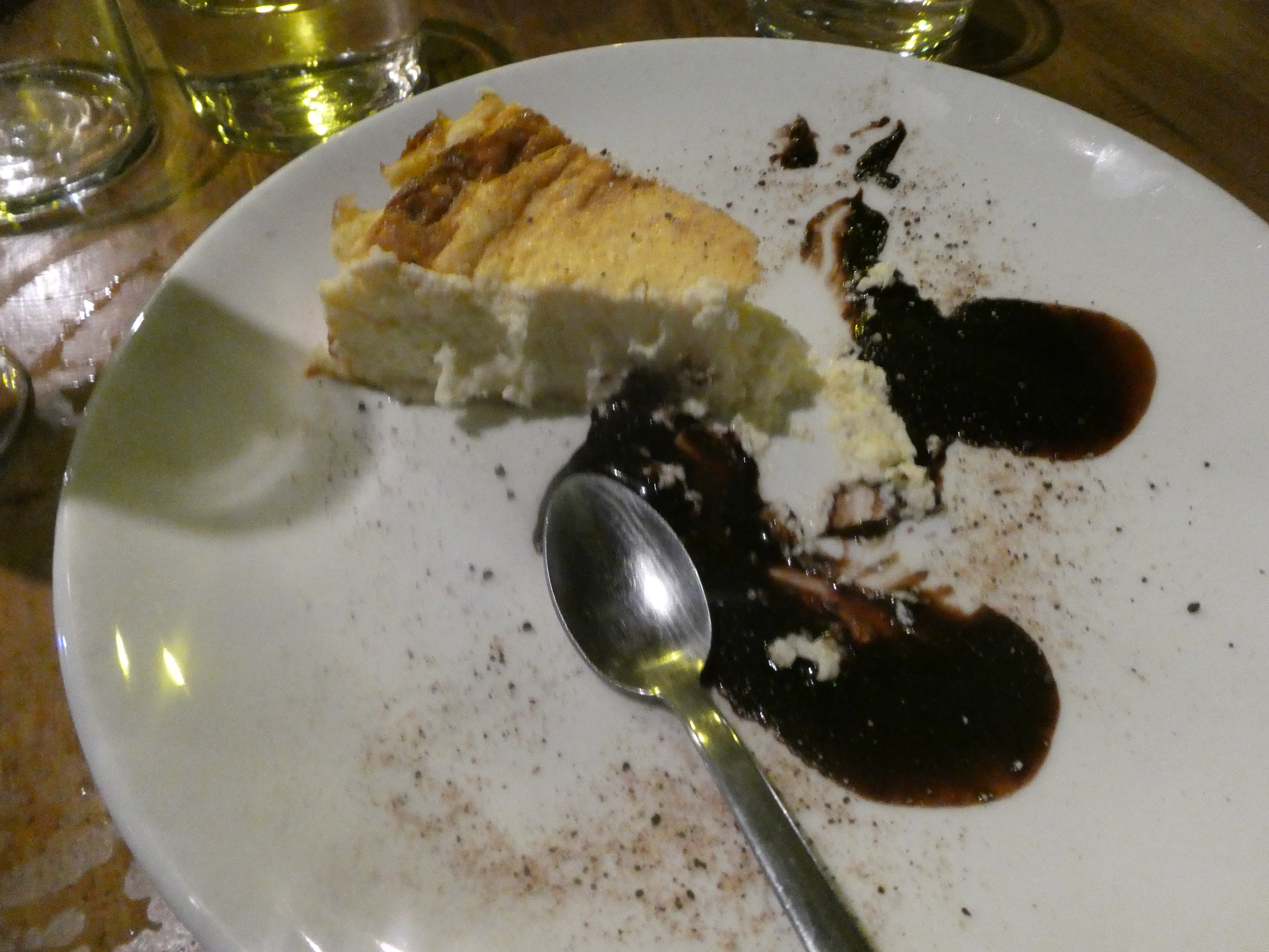 Our final stop was La Vinoteca Tapas and Bar, which was fortunately only about a 5 minute walk from my hotel. Here, we were served kava (the Spanish version of champagne that comes from the Barcelona region of the country) along with some cheese and crackers before having a piece of absolutely fabulous cheesecake with chocolate sauce. The cheesecake was really light and fluffy and not at all heavy. Perfection.
