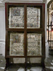 Now about the cabinet. Near the end of the Ambulatory was a large wooden cabinet with four choirbooks that dated to the 16th and 17th centuries. No one seemed to be paying any attention to the choirbooks, but I found them fascinating (and they reminded me of the choirbooks I had seen last weekend at the monastery in Italica.)