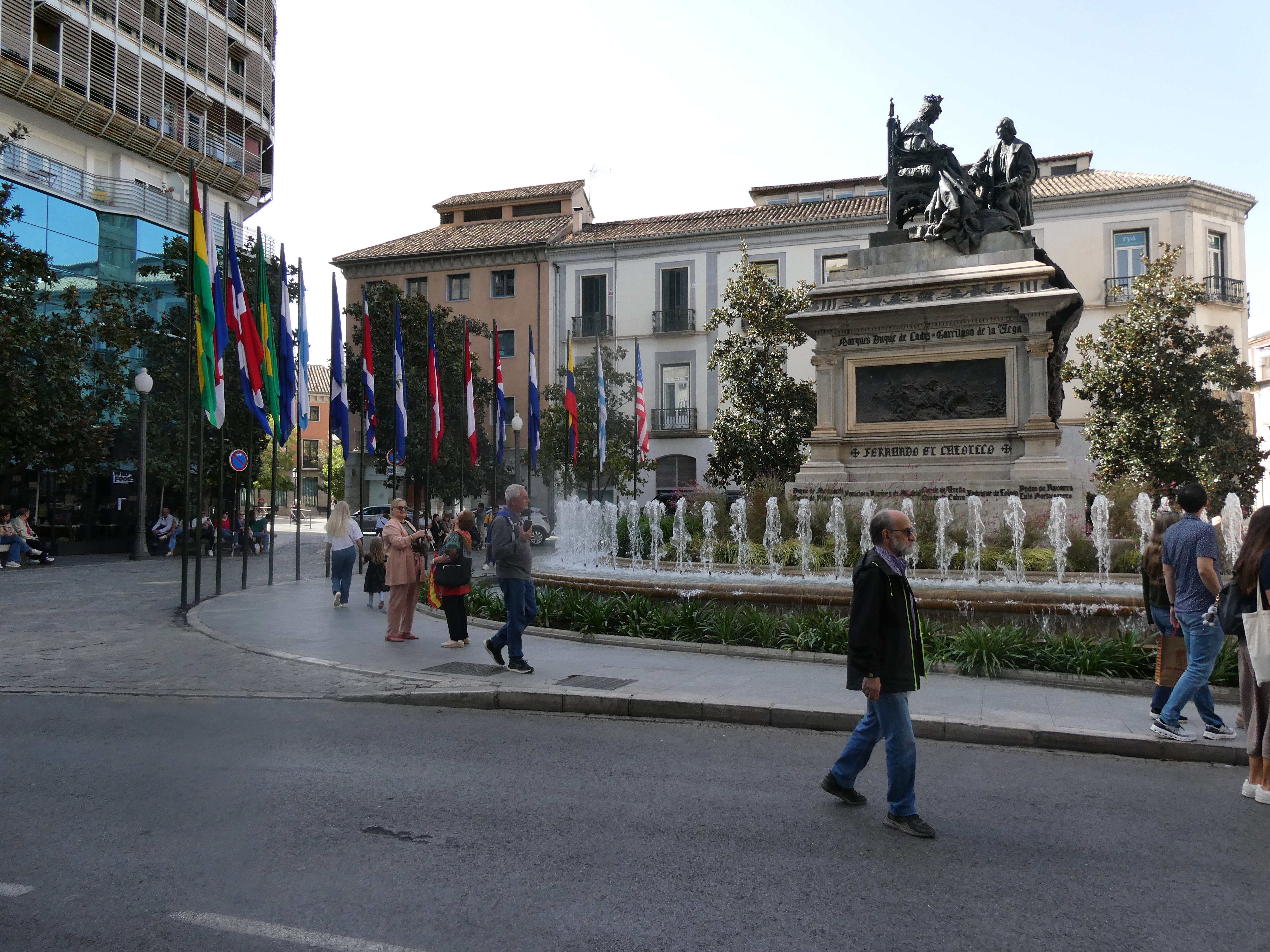 So from here, we doubled back down the alley and out onto one of the main streets in Granada where we stopped at the Monument to Isabella the Catholic. The statue depicts Christopher Columbus presenting to Queen Isabella and Christopher Columbus the contract evidencing the agreement between the two for Columbus to embark on his search for the new world in 1492 and for Queen Isabella to finance the project. The statue in located in Plaza Isabel la Catolica.