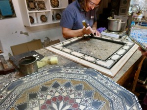 We then walked down a long corridor that was once the Medina, a place containing old shops and living areas for those who resided in the Alhambra. Usually these people would be shopkeepers, artisans, folks who maintained the Alhambra and regular townspeople. We ended up stopping in a shop where a gentleman was maintaining the traditions of cutting wood and glass to make intricate designs for frames, pictures and more.