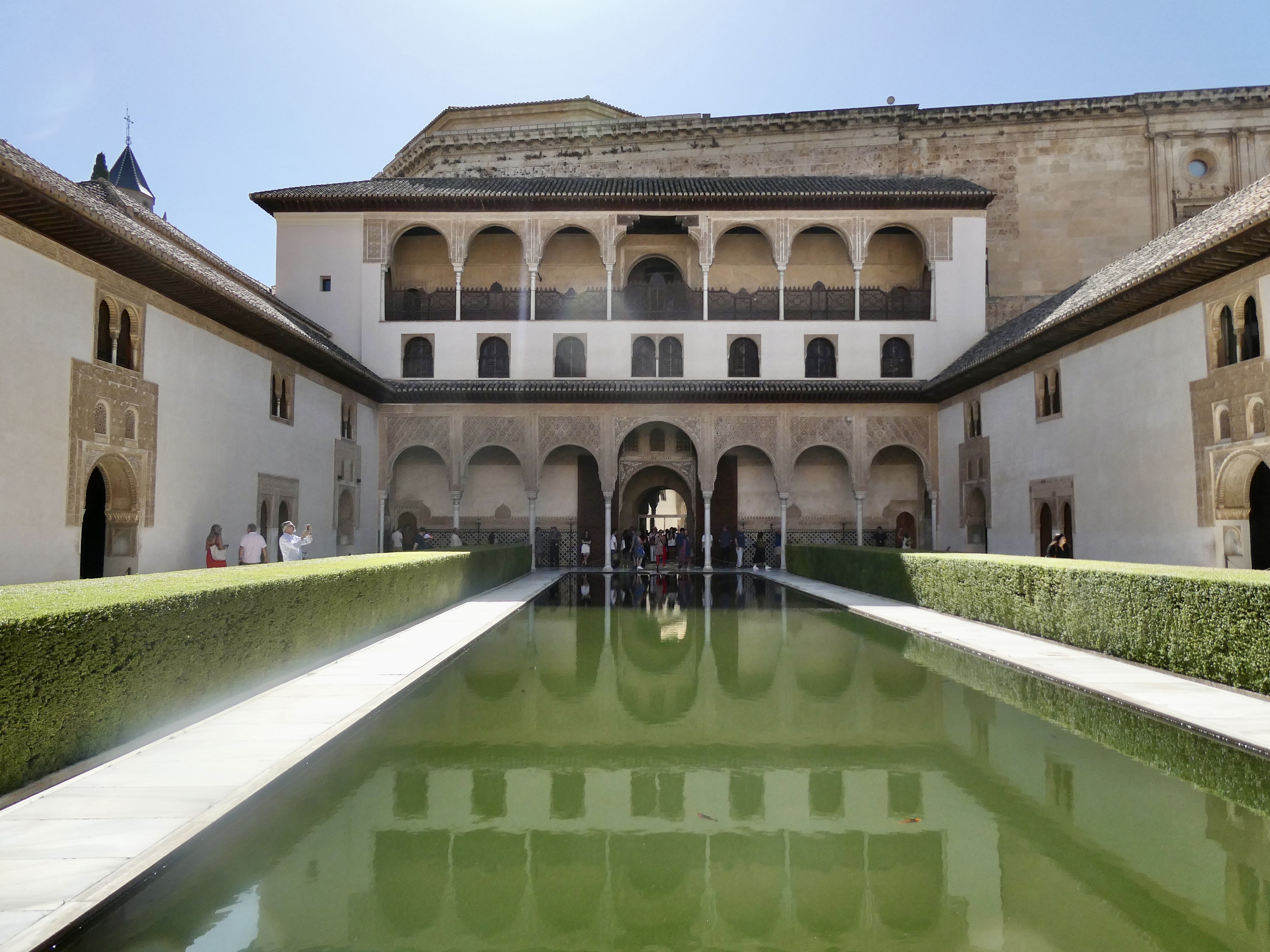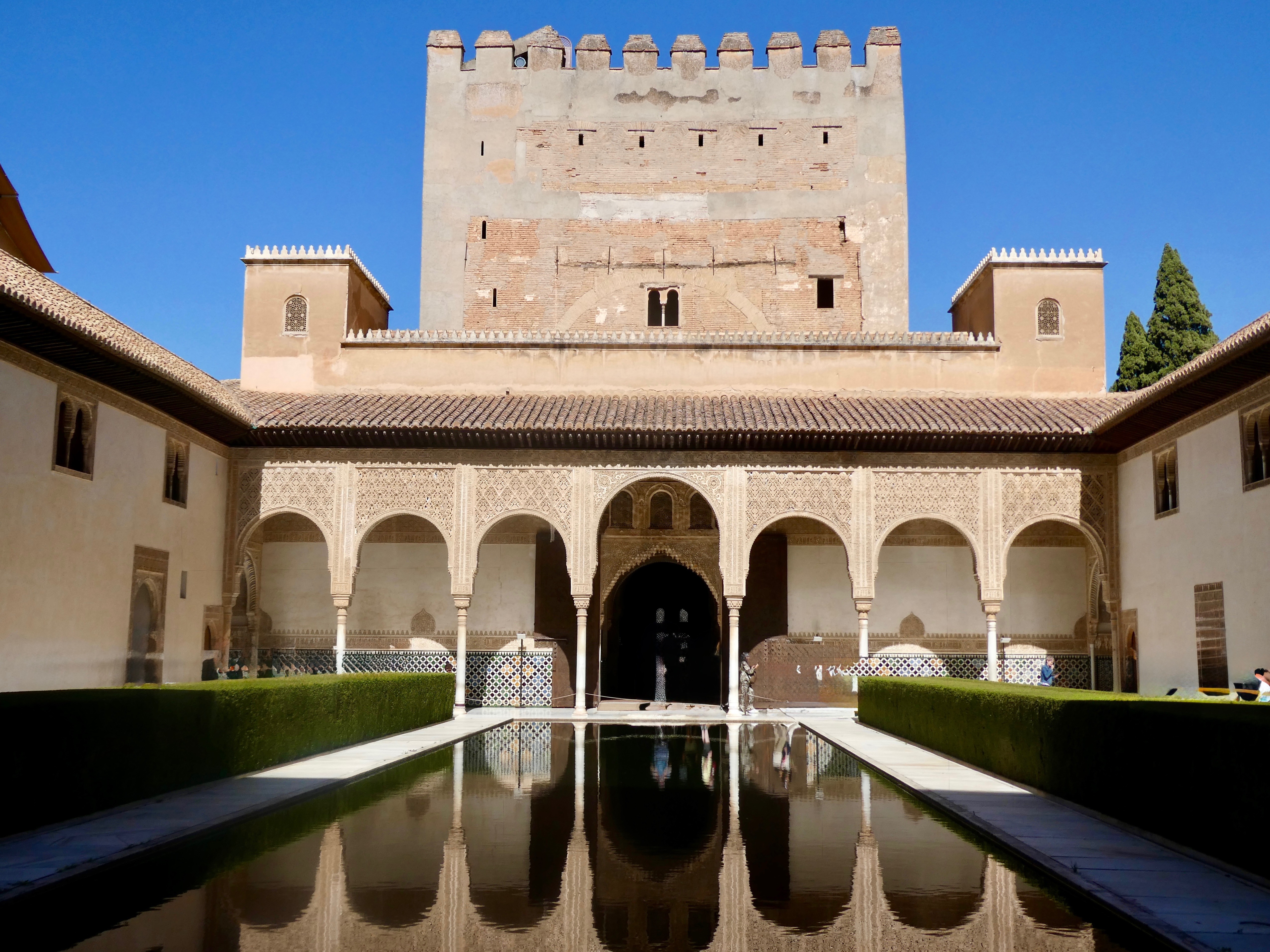 Now this palace was the official residence of the sultan/king. The Patio de los Arranyanes was surrounded by family rooms on either side of the courtyard, and there were also two small, absolutely gorgeous porticoes with towers rising behind them. The tallest tower was the Comares Tower, which rises over the Hall of Ambassadors/throne room.