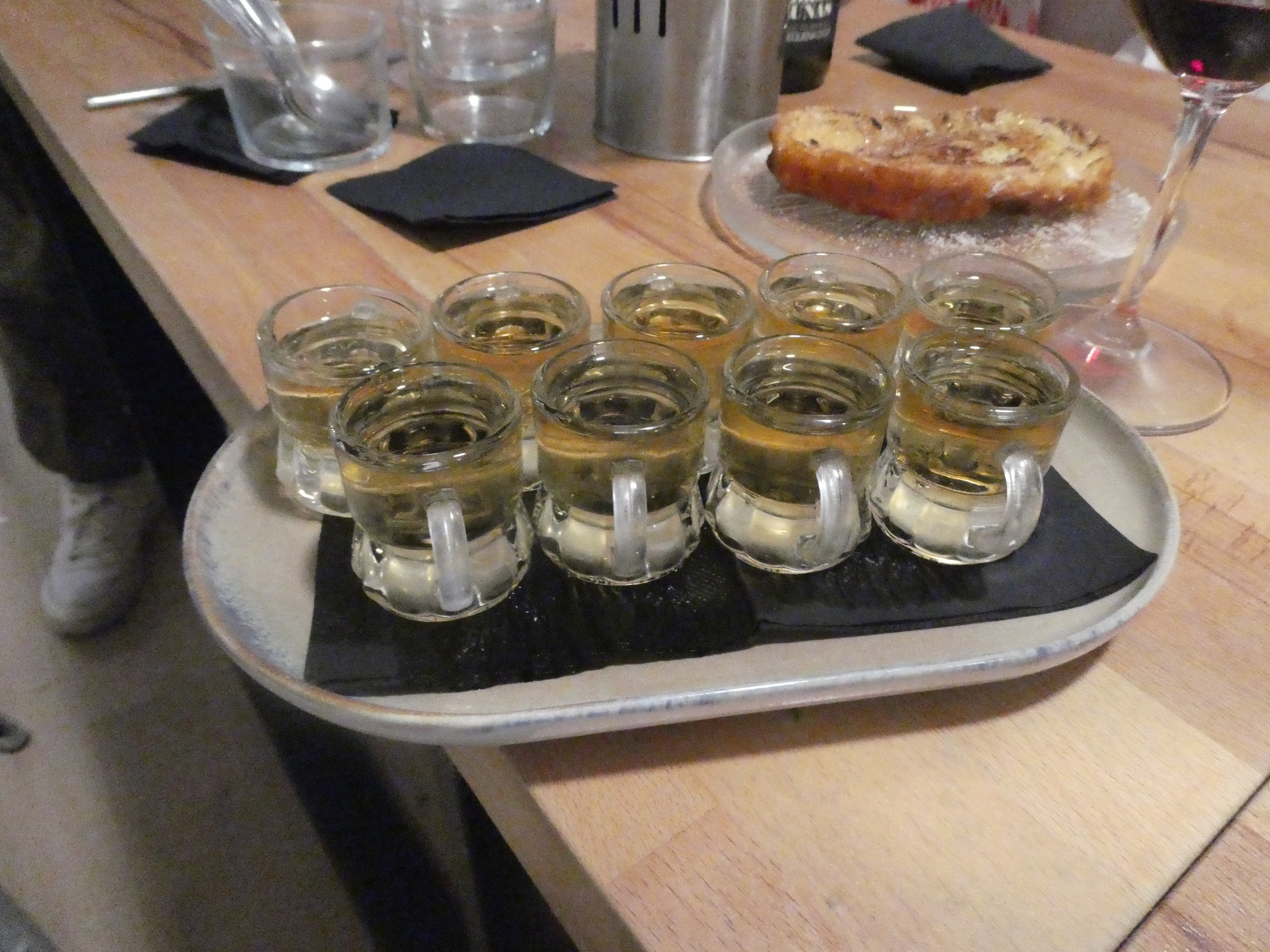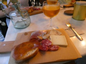 The food served here was basic but good. Cured tuna on bread, almonds, two different kinds of goat cheese, jamon and jamon sausage. I thought it was all really delicious. And we were served an orange wine with the tapas. The orange wine was OK, but the flavour was enhanced by the cheese. Without the cheese, I think the orange wine would have been a thumbs down.