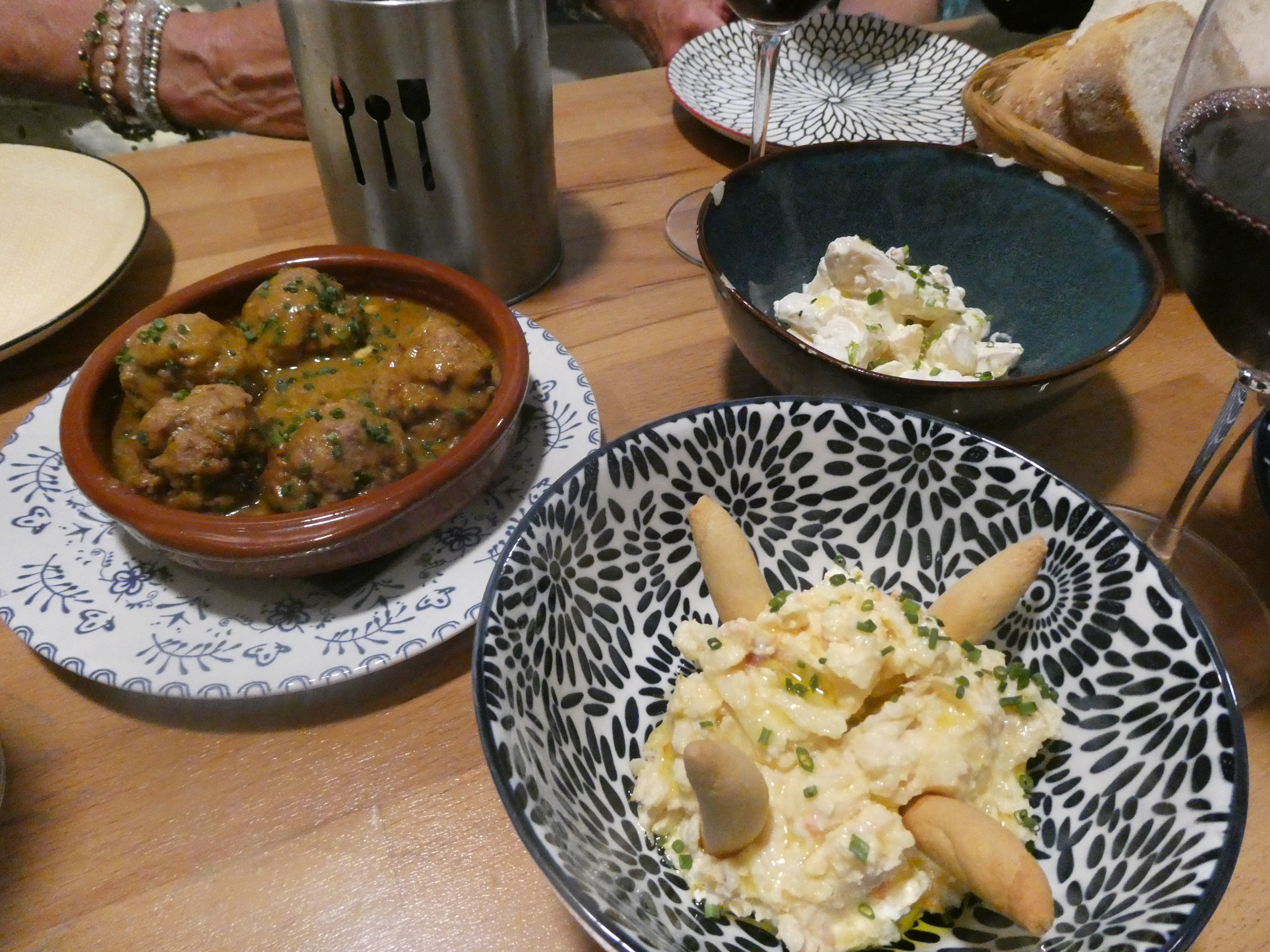 Russian salad with a twist (it contained rabbit instead of prawns) and Albondigas (Spanish meatballs) in a secret sauce (the star of the night). For desert we were served bread soaked in egg that was fried and then topped with sugar and cinnamon caramelized with a torch. We also had red wine (pretty good) and a shot of an almond aperitif.