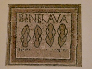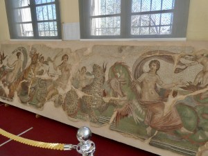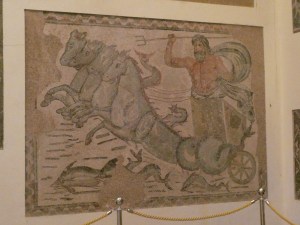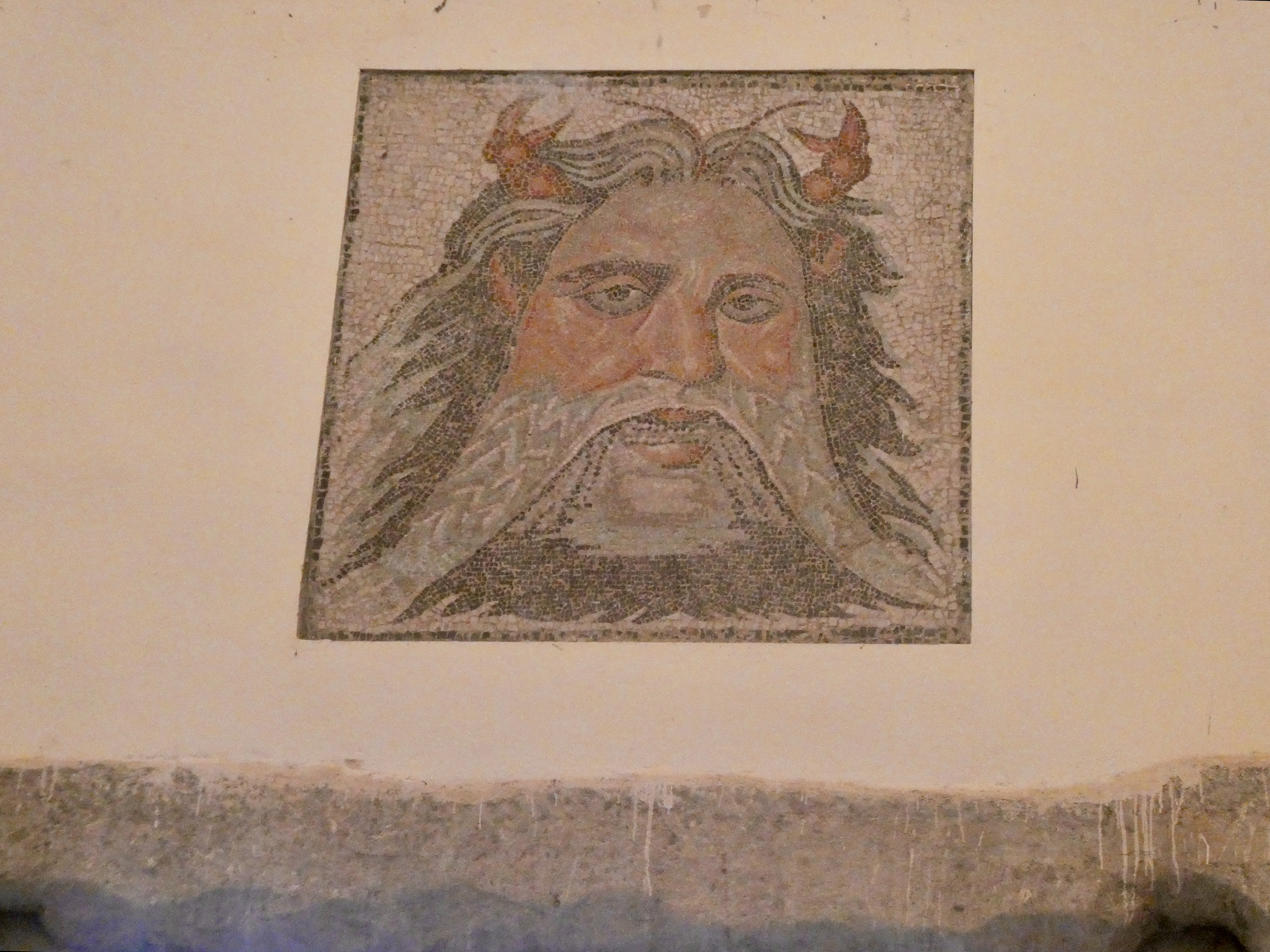 Now in addition to the fabulous welcome sign mosaic, three other mosaics that caught my eye were the large Neptune mosaic riding his chariot, a mosaic featuring a headshot of Jupiter and a mosaic depicting a number of Roman goddesses being protected by angels from sea creatures. The Roman goddesses mosaic was particularly impressive because it featured tiny, tiny ceramic and glass squares making up the mosaic. And apparently the size of the mosaic square is indicative of how old the mosaic may be. The larger the mosaic square the older the mosaic. Given the size of the Roman goddesses mosaic squares it is believed the mosaic is from the 4th or 5th century.