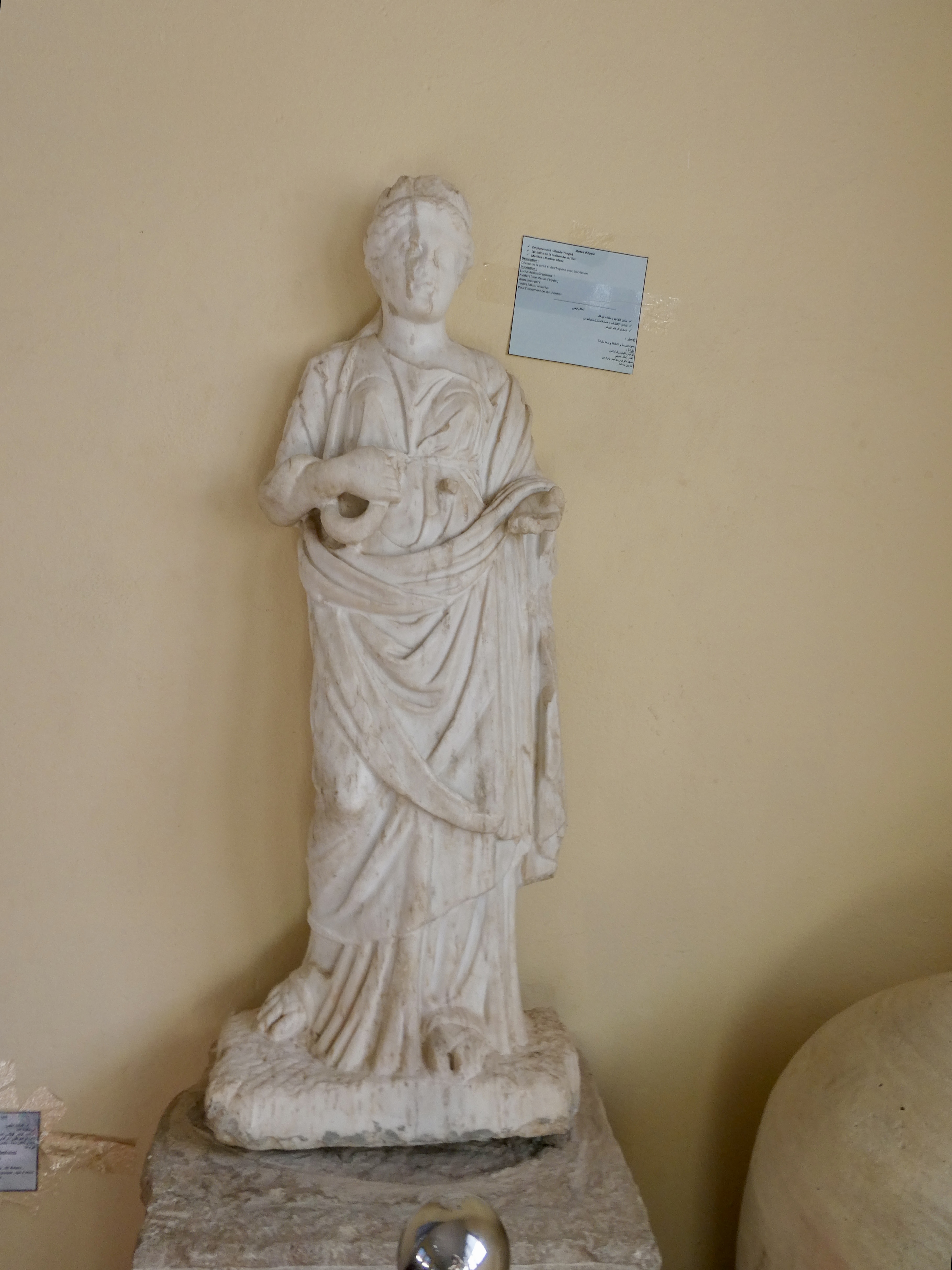 In another room in the museum we had a look at some ceramics, oil lamps and two statutes: one was a 4th century statute of a Roman god, but neither Nahla or I could decipher the name, and the other was a 4th century statute of Hygieia, the goddess of health.