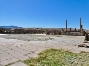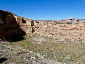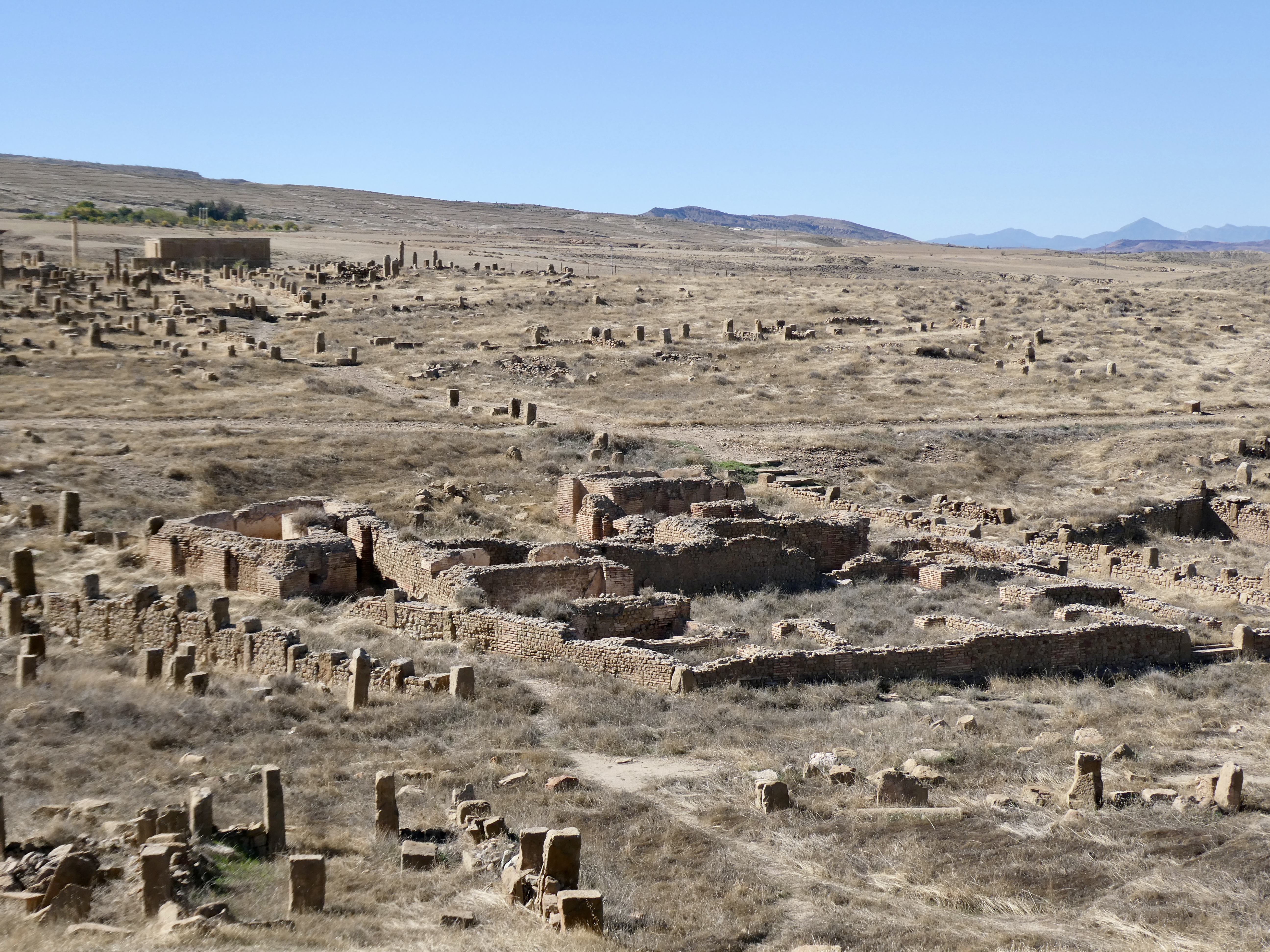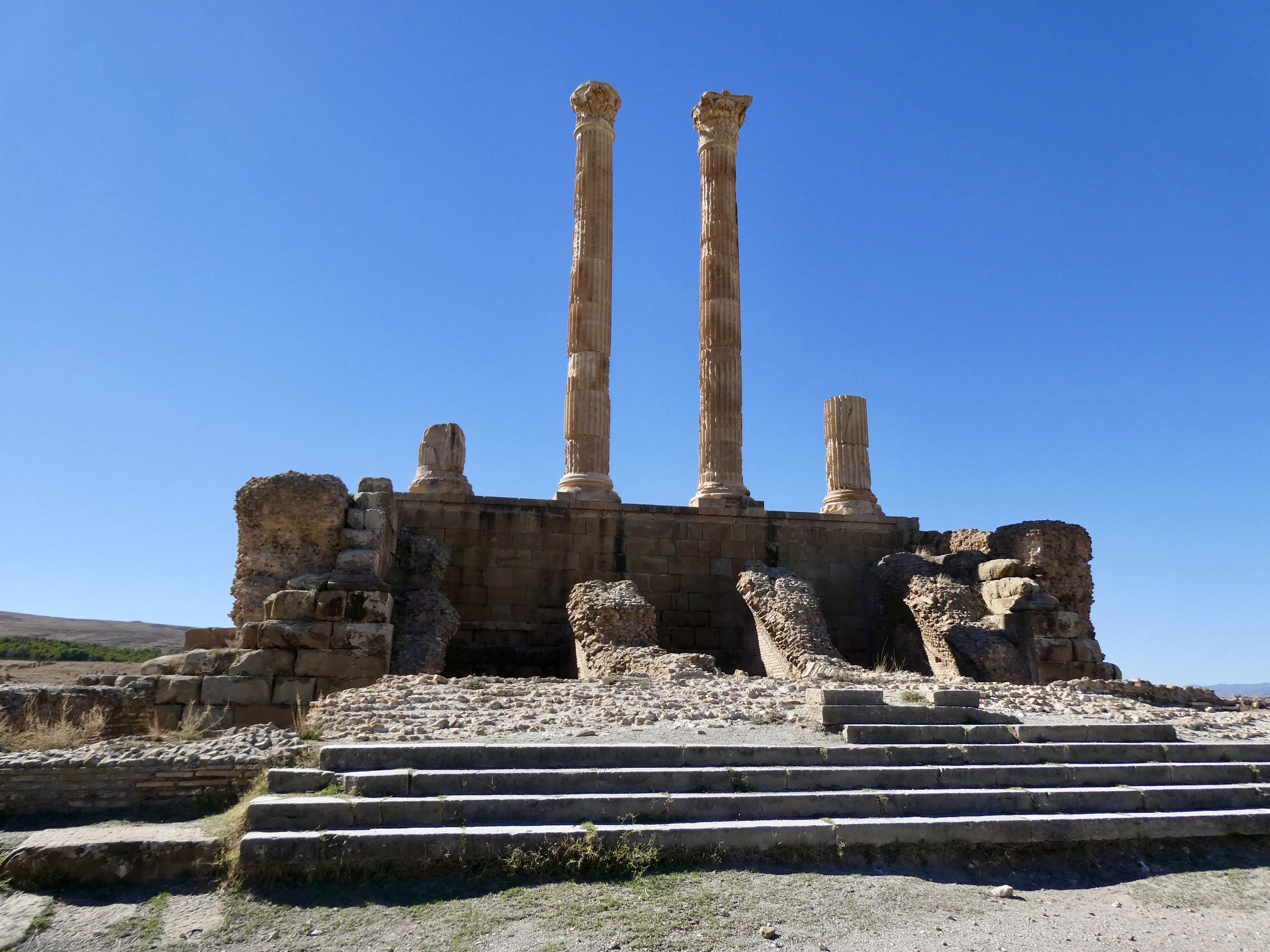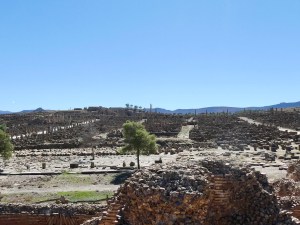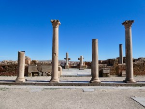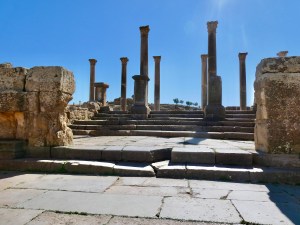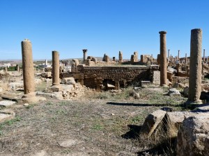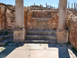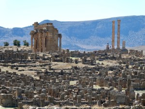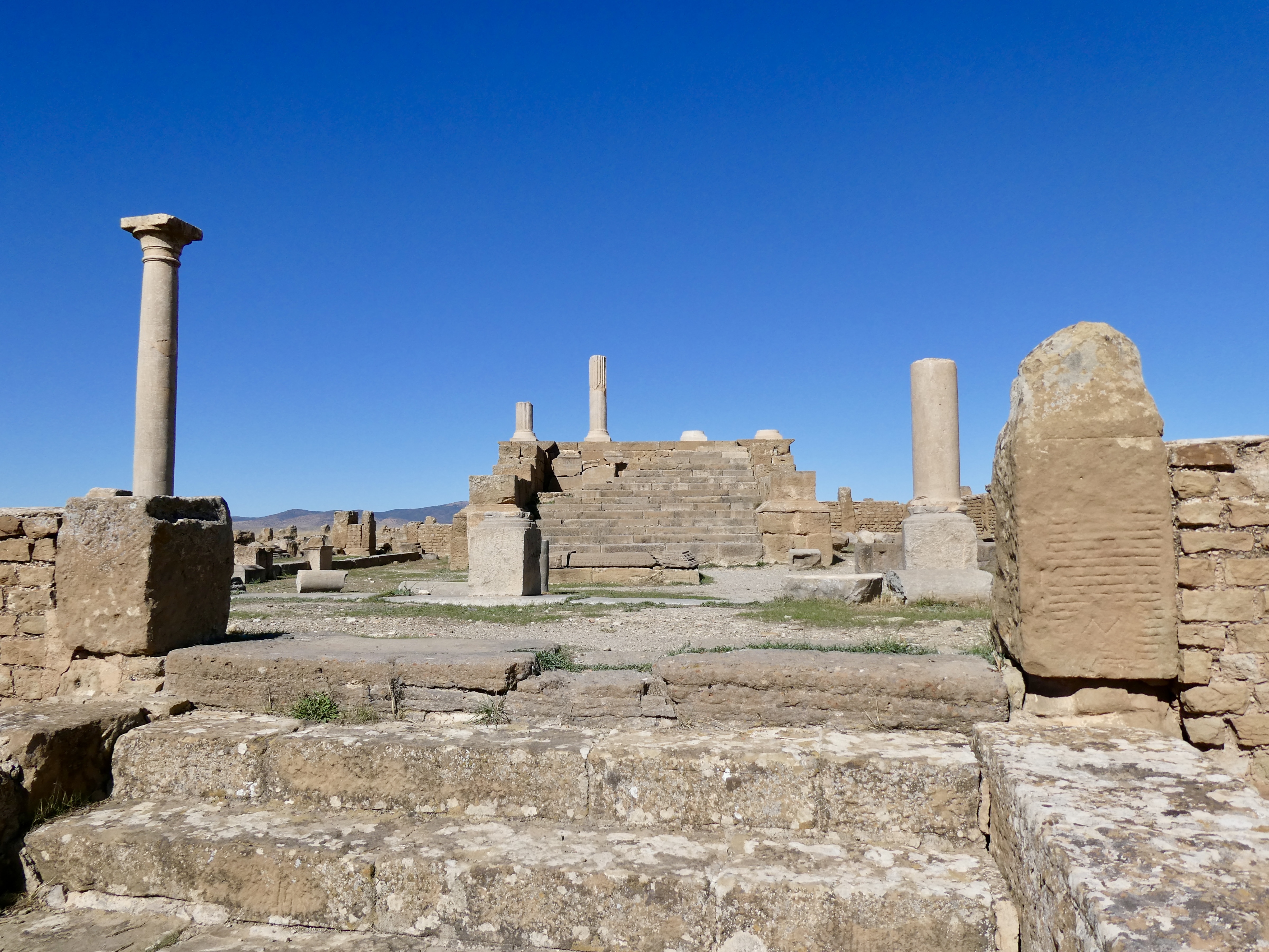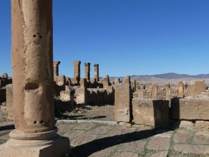 Anyway, after the visit to the theater we walked to the far east side of Timgad to the dividing line between the original town and the “new town” where the Christians constructed their own buildings in the 4th and 5th centuries. It was just at the edge of the new construction that we were able to view the Capitolioum Temple.