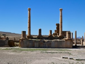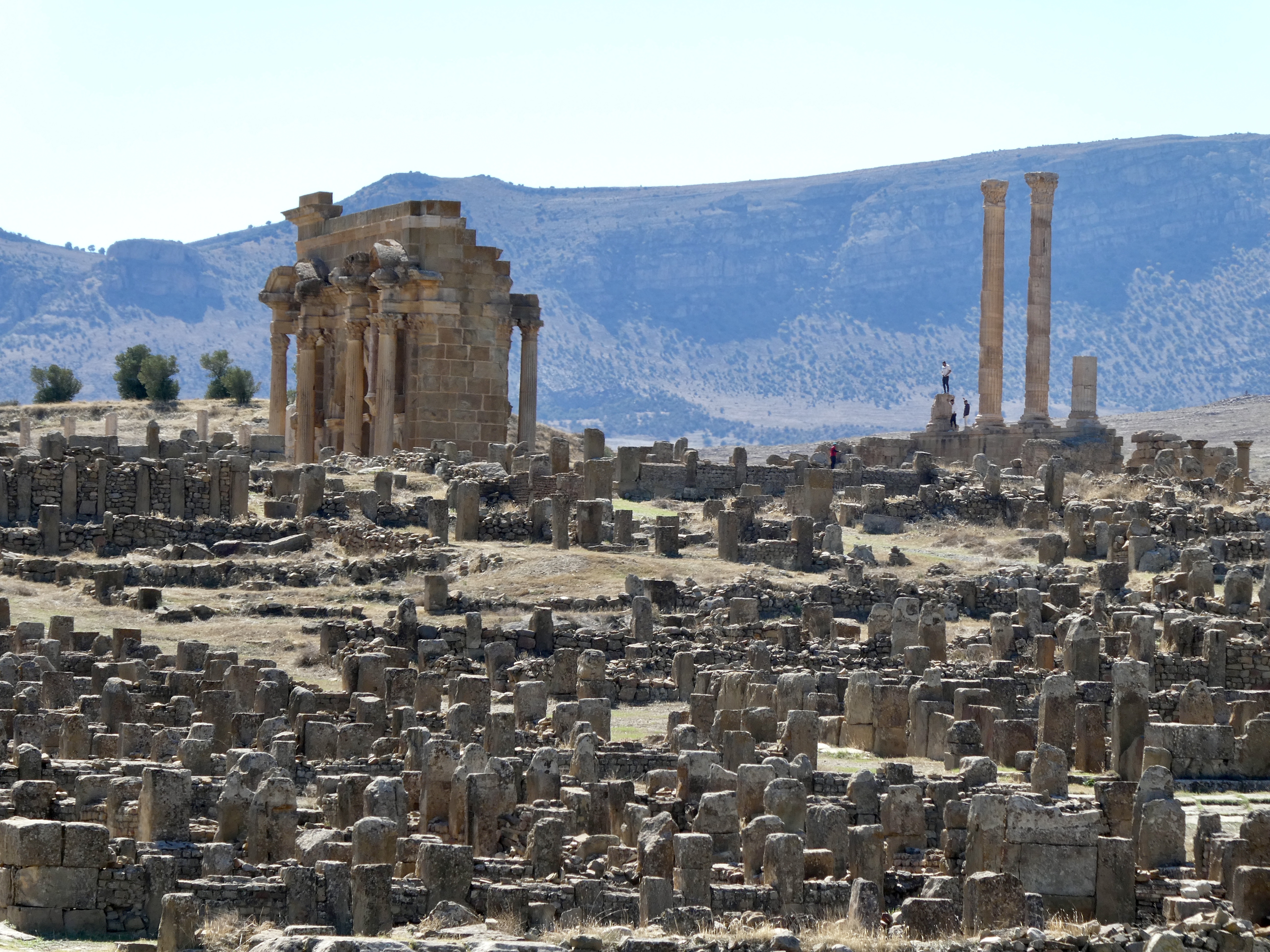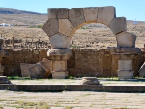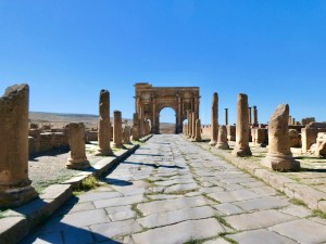Anyway from here we walked across the street to reach Timgad’s most famous ruins, the Arch of Trajan, a triumphal arch which was at the eastern end of the city and was a connector of sorts between old Timgad and new Timgad. The road leading from the arch to the new area is lined with columns and if you looked closely at the road running through the arch you could see the groove marks in the stones that had been made by chariots charging through the gate.