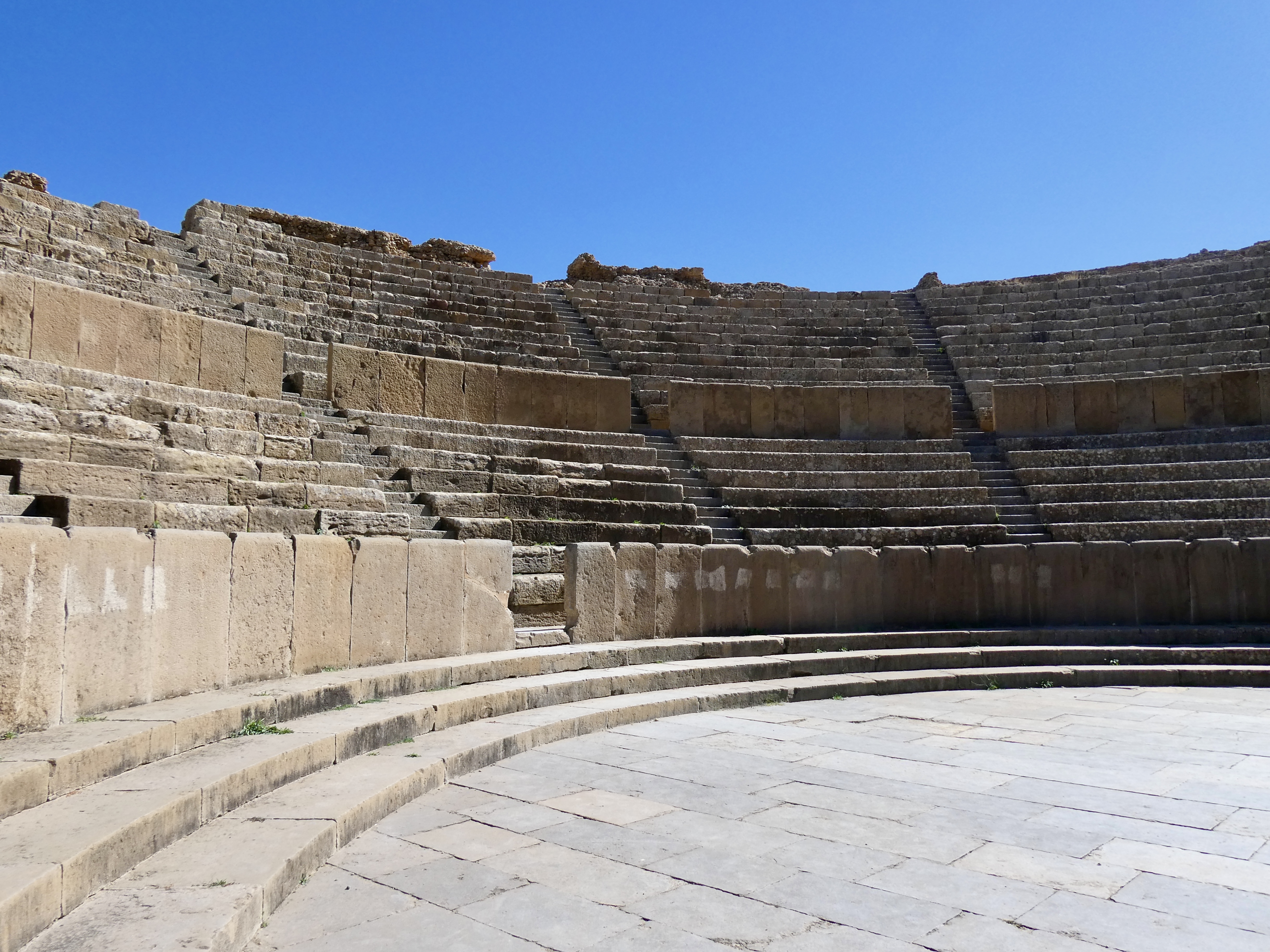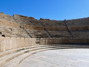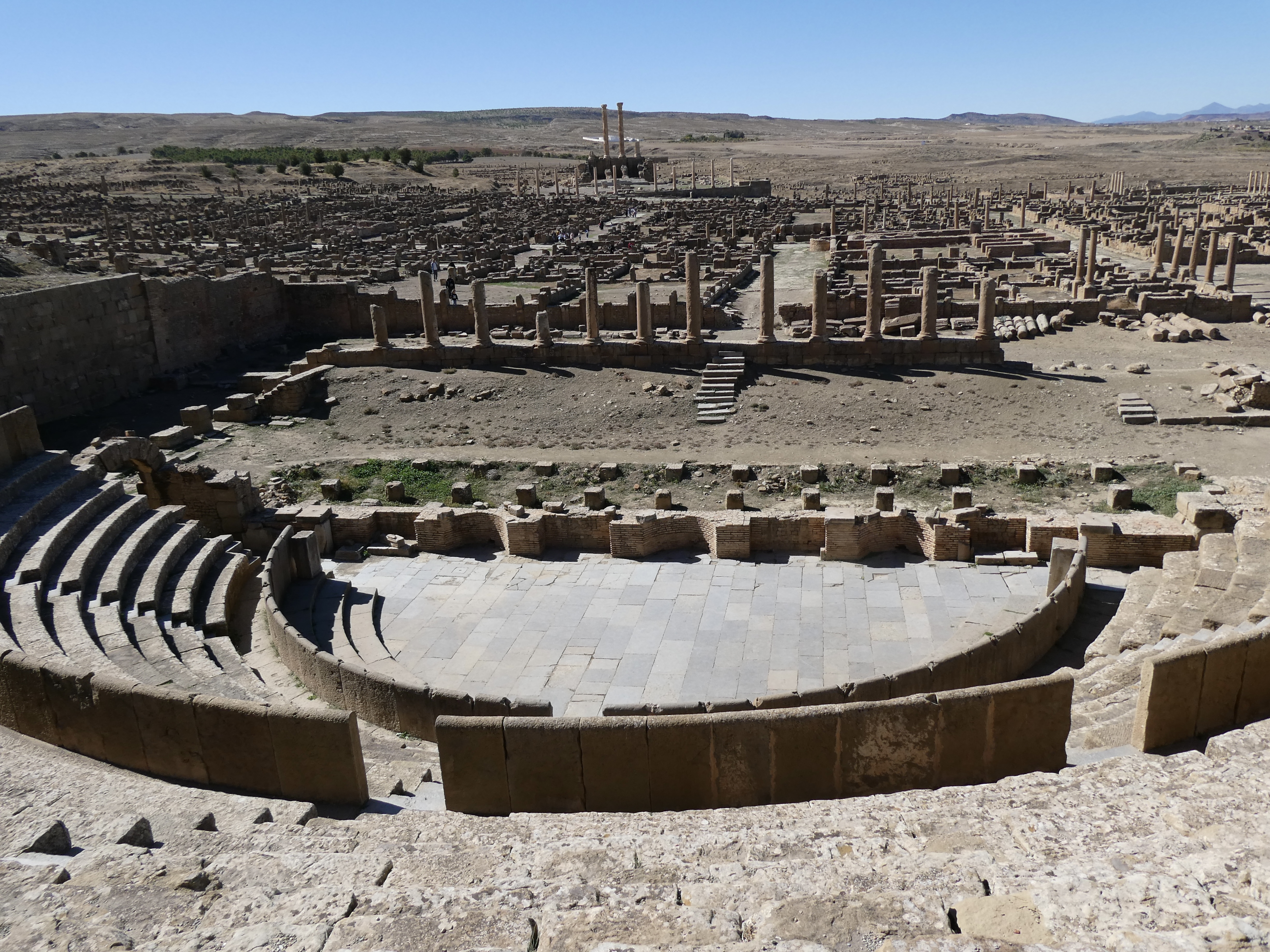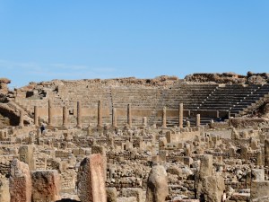 So from the Forum we walked across the lengthy square to one of the two premier sites at Timgad, the magnificently preserved theatre. The theater was cut into a small hillside and was apparently inaugurated in 169 AD. The theater was used for theatrical performances and political speeches, but was relatively small in size seating only 3,500 people.