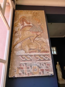 Now all along this first corridor of the museum were copies of 1st century BC Roman heads. Apparently the originals were taken by the French to the Louvre Museum so I walked by a lot of these copies. However, also on this corridor was an amazing original, near in intact mosaic titled Triumph of Bacchus from the 3rd century AD that was found in the remains of a Roman villa in the early 20th century. The mosaic features the Bacchus, god of wine, on a chariot pulled by two tigers returning from his conquest of India. His companion Ariadne is also featured in the mosaic.