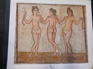 After checking out the courtyard, I walked past more amazing marble statutes before stopping at a late 4th century mosaic titled Mosaic of the Three Nymphs aka Mosaic of the Three Graces dating from the mid to late 4th century AD. The mosaic featured the three daughters of Venus and Bacchus: goddess Aglaia representing beauty, elegance, brightness, and splendor, goddess Thalia representing festivity, bloom, and abundance and goddess Euphrosyne representing joy, mirth, and good cheer. The goddesses are associated with Aphrodite, the goddess of love and beauty. The mosaic was found in the remains of a Roman villa known as the House of Lulii.