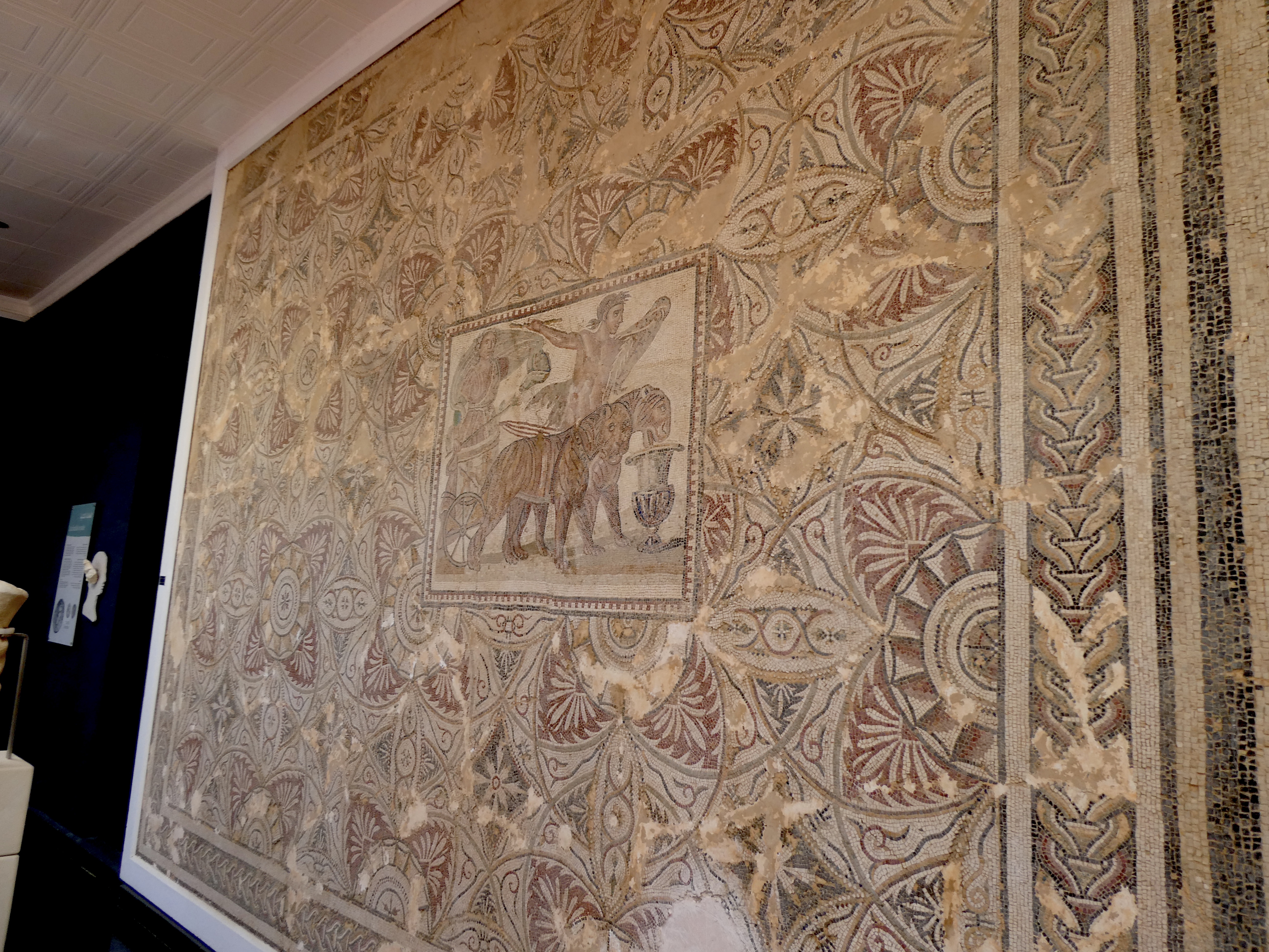 Now all along this first corridor of the museum were copies of 1st century BC Roman heads. Apparently the originals were taken by the French to the Louvre Museum so I walked by a lot of these copies. However, also on this corridor was an amazing original, near in intact mosaic titled Triumph of Bacchus from the 3rd century AD that was found in the remains of a Roman villa in the early 20th century. The mosaic features the Bacchus, god of wine, on a chariot pulled by two tigers returning from his conquest of India. His companion Ariadne is also featured in the mosaic.