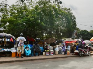 Today we left Kaolack (where we spent the night) and headed south for about two hours to the Senegal/The Gambia border. Now talk about a sh*t show. Big rigs full of various products were lined up for miles. Men, women and children were selling everything under the sun from baskets they carried on their heads and from stands set up on either side of the road. There were even men herding goats through the border. And then there were the children begging for money who had apparently been brought here by their parents from Burkina Faso (a neighboring VERY poor country).