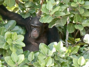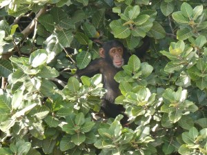 From here, we continued on to the largest island and it wasn’t long before both the Captain and Malang spotted a baby chimpanzee hanging out on a branch. And nearby in the leaves of the same tree was mama chimpanzee.