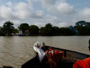 Now the boat drivers will not leave the dock until all 12 seats on the boat are full. And while we sat and waited, the boat was loaded with lots of locals as wells as buckets of rice, cloth wraps filled with groceries and even a motorcycle, which its owner had to hold on to for the duration of the trip across the river.