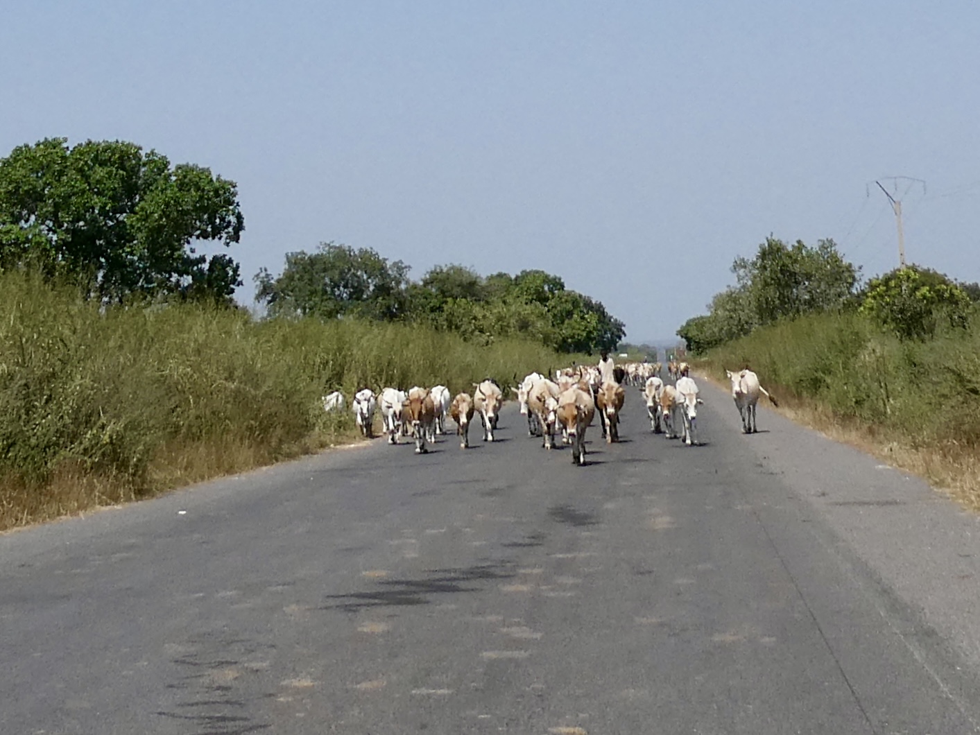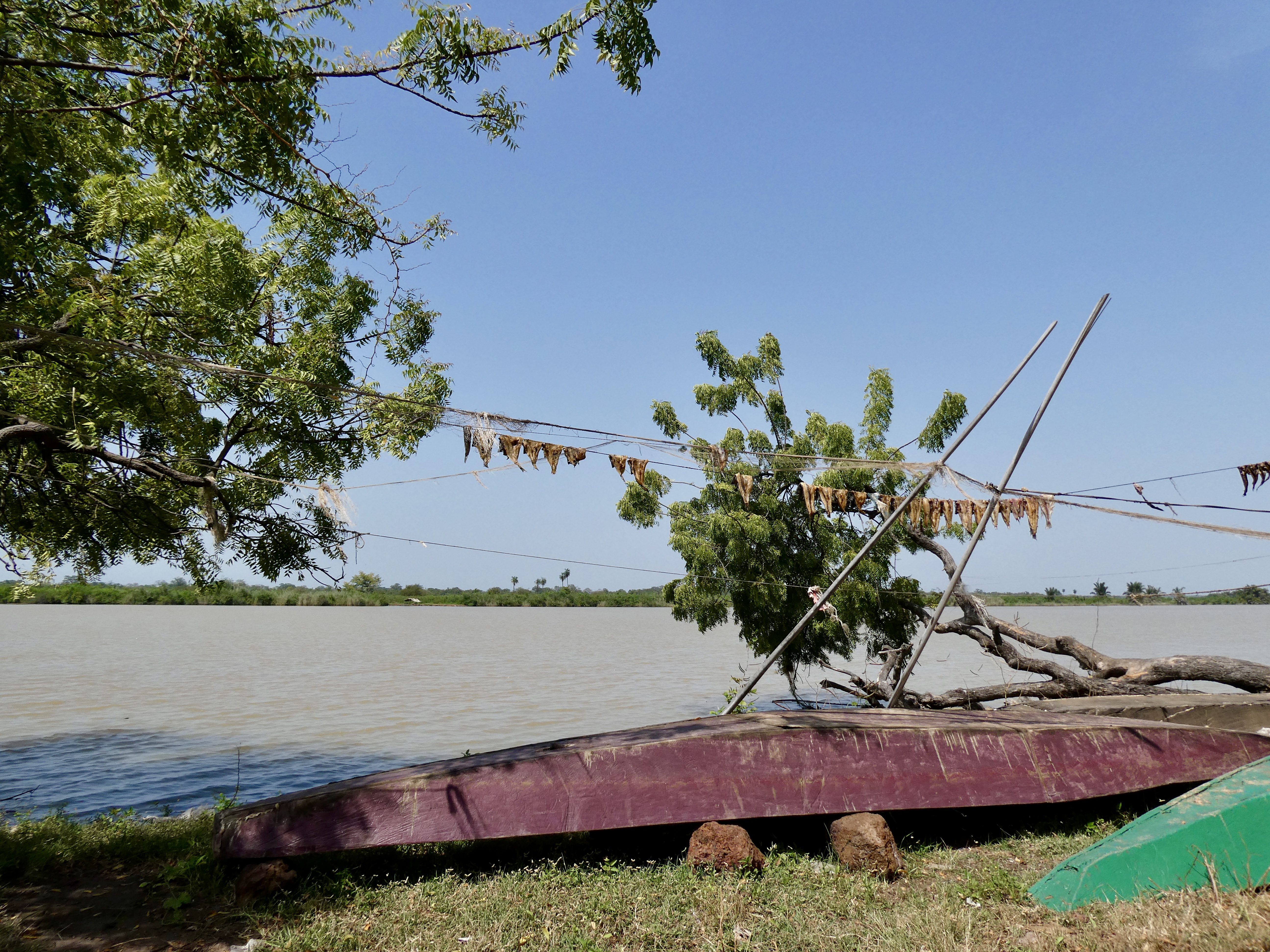 The boat trip was virtually the same as the trip across only this time we had two motorcycles on the boat instead of one. Once on the other side, we headed back to the Kauntaur and the hotel. Along the way we ended up stopping for an enormous herd of cows, passed a field of little egrets (they are everywhere in this area) as well as the village goats, men untangling their fishing nets, kids washing in the river and even fish drying in the sun. That is Africa for you!