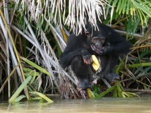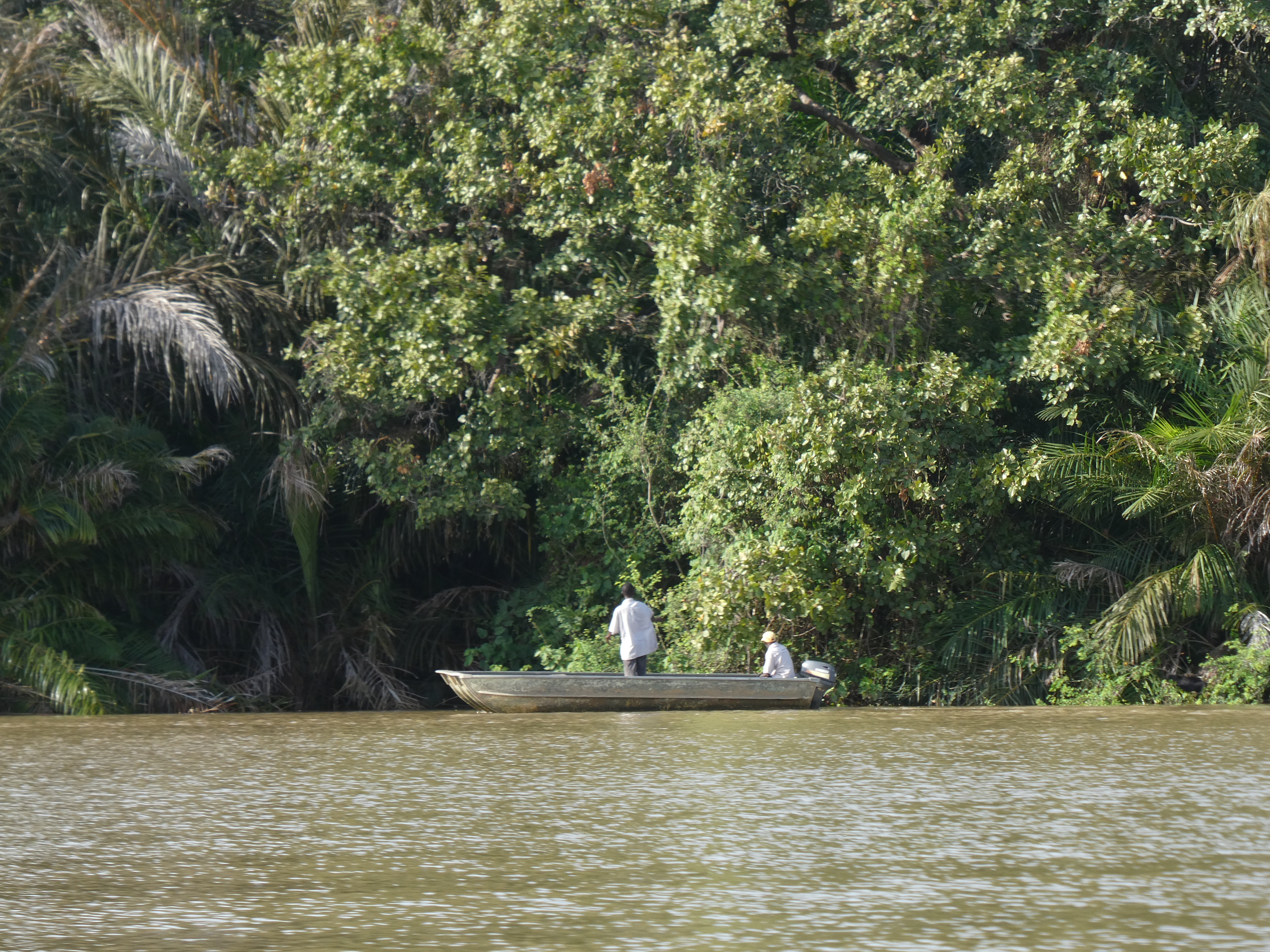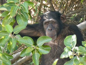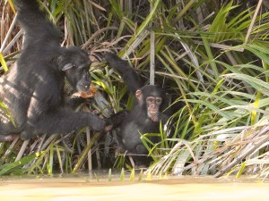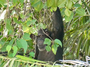 So just after 3:00 we piled into the boat and took off for the islands. The Dutch guys really wanted to see hippos so that was top of the list. But first up, we would take a swing by the main island to see if there were any chimpanzees and … score. We immediately spotted a young chimpanzee hanging out under the trees near the shoreline.