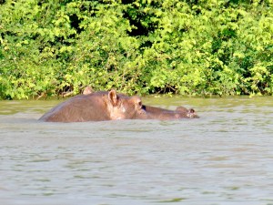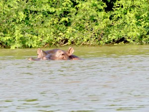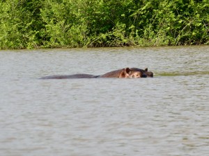 We ended up spending about ten minutes watching the two chimps before moving on to look for hippos. And luck was with us today. As we puttered towards the shallow part of the river, a hippo surfaced in the distance and then quickly ducked under water. We moved in closer and saw it surface