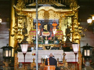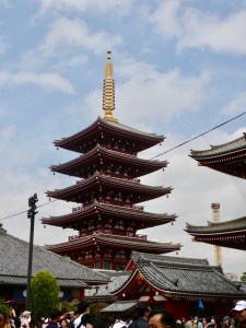 At the end of Nakamise Street was Hozomon Gate and then behind this second gate was the temple’s main hall and a a five storied pagoda. We had bypassed Nakamise Street entering the temple are through a side street and then under the Hozmonon Gate to the front of the pagoda and the temple’s main hall. The pagoda was gorgeous, but the front of the main hall was packed with tourists and an awful lot of incense burning (made me cough).