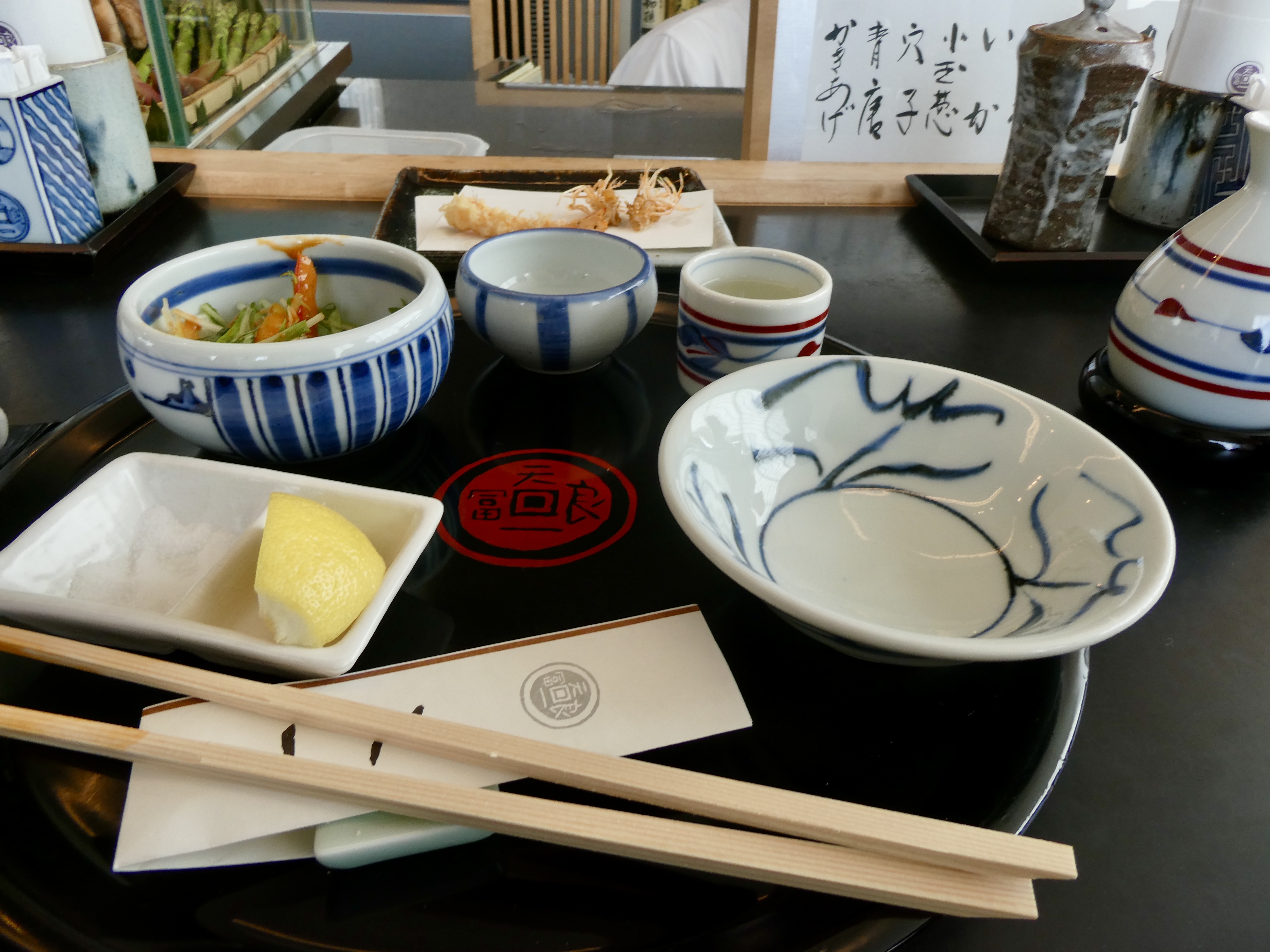 We took a quick walk through the building and then headed down the street to another high rise. (Mr. Nagasaka had some health issues over the past couple years, but I had to almost run to keep up with him as he walked down the street.). Once at the second building, we took the elevator to the ninth floor and then up the escalator a number of floors to a tempura restaurant, where we proceeded to have a chef stand in front of us and make us the most fabulous meal including salad, miso soup, tempura seafood, tempura vegetables, radish root shavings (actually very good) and of course, sake (although Mr. & Mrs. Nagasaka had a beer) and then green tea.