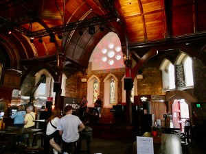 After the tour through the park, we ended walking down the street Tom and I had visited the night before with the old colonial buildings before circling around the block in the direction of the stadium under construction to what appeared to be yet another church. And in fact, before the earthquake, the building had been a church, but was now restored to … the Church Bar. We took a walk through the building and it was in a word … fabulous. In fact, after our tour was over, Tom and I came back and enjoyed a fabulous lunch of fish and chips and wood fired pizza.