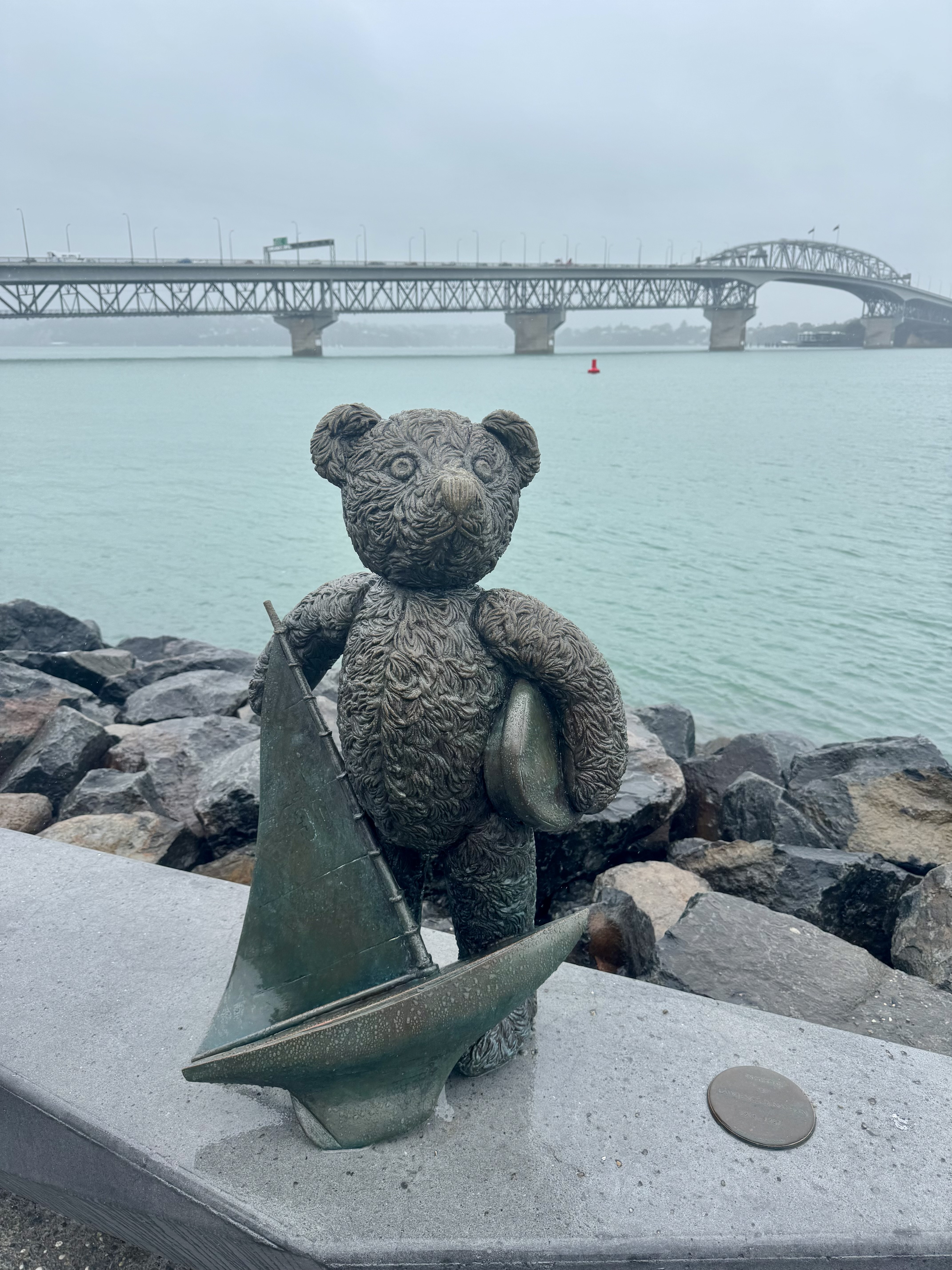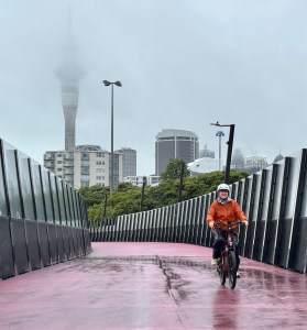 So after a brief introduction to the bikes and a bit of practice, we set out on the waterfront bike path to Westhaven/St. Mary’s Bay (they were filming a movie there) and past the myriad of yachts to a lookout point where we could make out the Auckland Harbor Bridge through the mist and clouds.