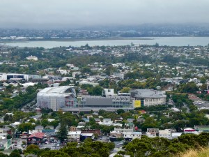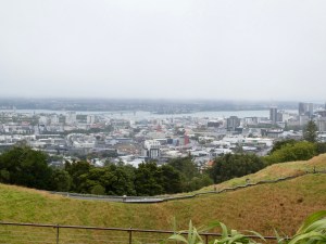 Now the good news is that the rain had stopped so by the time we reached the top of Mt. Eden, the clouds were lifting and we actually had a pretty good view to the city, including Eden Park, home of the famous All Blacks New Zealand rugby team. In addition, the Auckland Harbor Bridge was now clearly visible and we even had a decent view of the Auckland Sky Tower. And all around us we saw little mounds, which were a reminder that this city is built on ancient volcanoes.