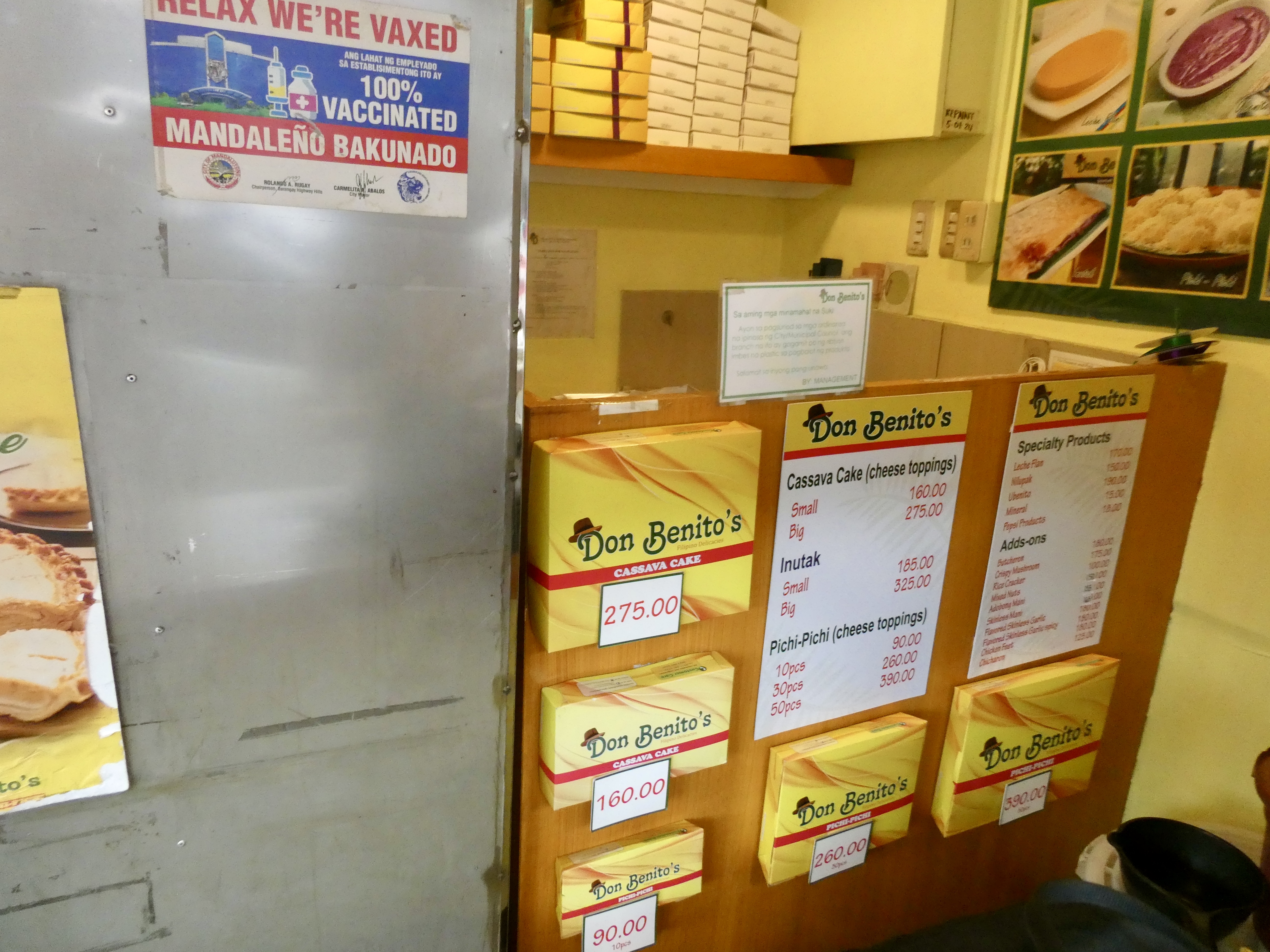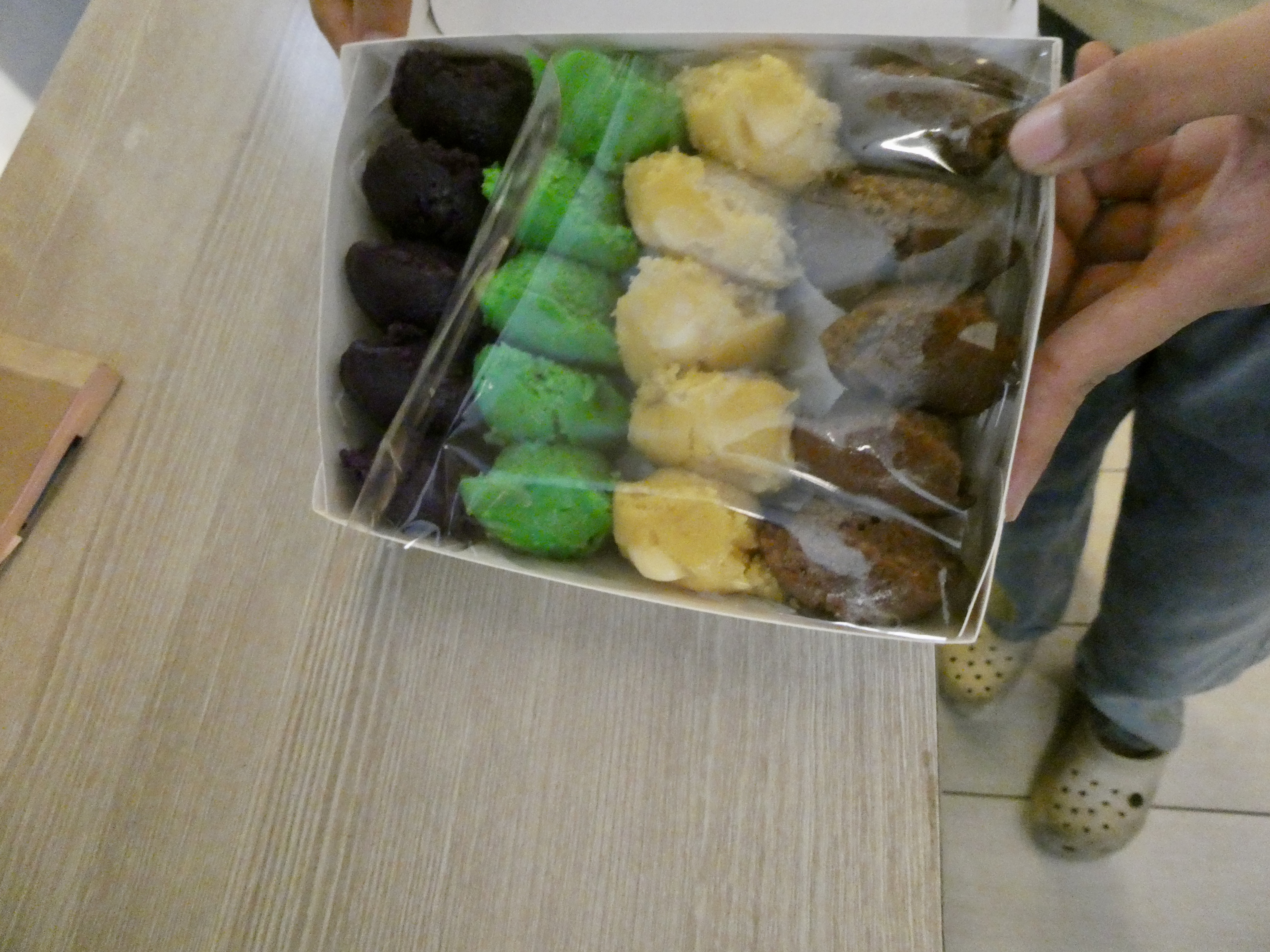 From here, we crossed the street to a store where Nel purchased a box of puto, which is steamed rice cakes made of fermented rice. These rice cakes were each a different colour and were flavoured with pandan (green leaf), cheese (yellow), ube (purple yam) and mascobado (brown and made with molasses). We were going to take this with us to our next stop.