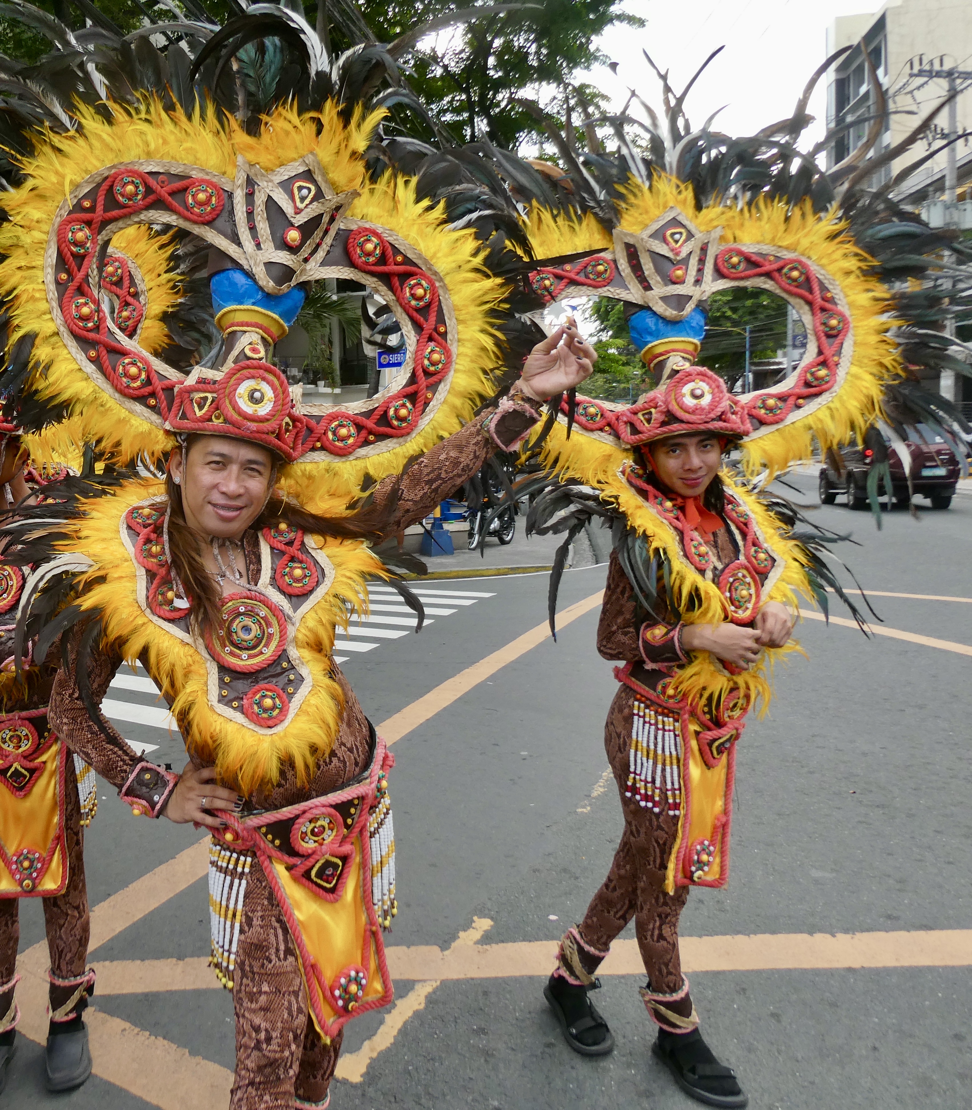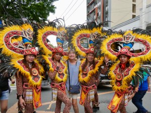 Anyway, in addition to the banana ketchup, Nel had me mix vinegar, lime, chilies and soy sauce to make a second dipping sauce. And as we waited for the meat skewers to appear, a band started playing nearby. We went to take a look and it turns out that the store on the corner was having its grand opening and it had some local kids playing music. The music even attracted a group of folks in full costume who had been marching in the Manila Gay Pride Parade. And of course, I had to run over and have my picture taken with these fabulous people who appeared very excited that I wanted a pic with them. (Happy Pride Month folks!!!)