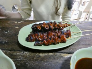 So after the photos Nel and I went back to the table and our skewers were brought out a few minutes later. There were six skewers and Nel selected each one I was to try without telling me what the skewers were. First up was God awful. Jelly like and spongy … turns out it was a pig’s ear. Uh no thanks. Second up was another yuck … chicken livers. I have had these before and hated them then and still hate them. Third was my favourite. A bit chewy, but something I grew up on … chicken gizzards. I ate the entire skewer. Fourth up turned out to also be pretty good … chicken intestines. This apparently is a favourite in the Philippines. Fifth almost made me gag … pig intestines. It had a horrible and I mean HORRIBLE after taste. The final skewer was just regular pork and it was delicious.