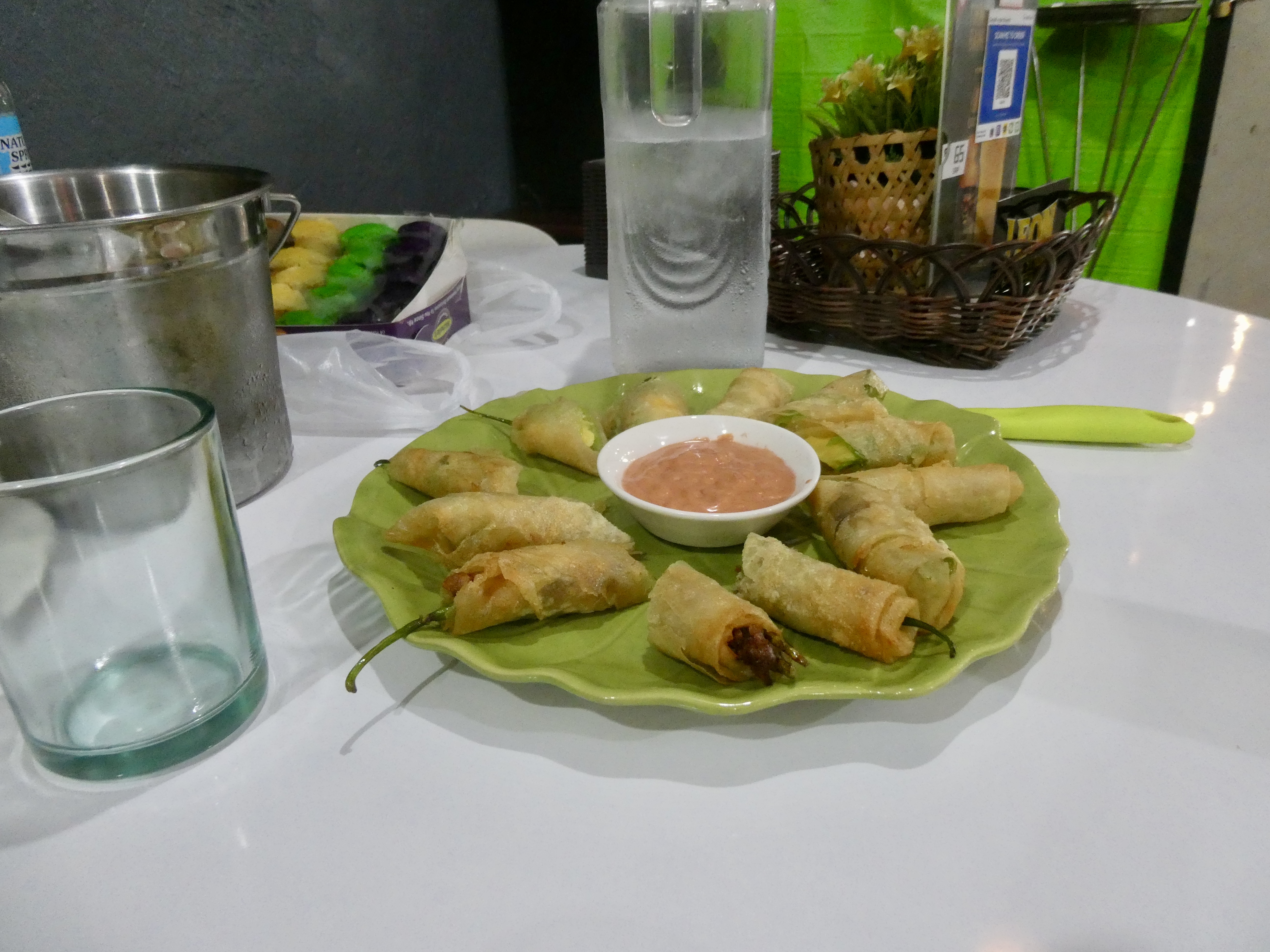Anyway, once we hopped out, we walked about a block down the street to Sutukil, which was part pool hall and part bar serving beer and pulutan, small finger foods that are often eaten with beer. Nel and I found a table in the back room and I was quickly served a San Miguel beer (fabulous) and shortly after that a plate of pulutan. Now this pulutan was made of lightly fried jalapeño peppers and cheese and lightly fried jalapeño peppers and ground up porks head (seriously).